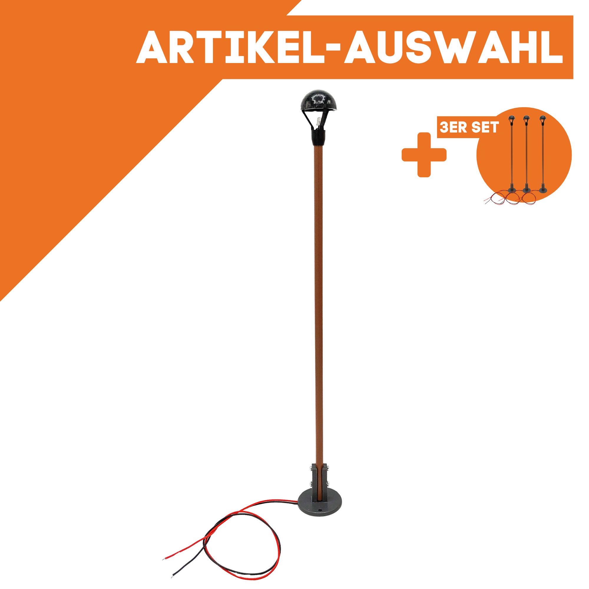 Für die Beleuchtung sorgt eine warmweiße LED, die direkt mit 5–24 V betrieben werden kann. Sie liefert ein realistisches, energiesparendes Licht und verleiht der Lampe eine stimmungsvolle Ausstrahlung. Die Befestigung erfolgt über einen verschraubten Sockel, sodass die Lampe einfach und sicher auf der Anlage montiert werden kann.