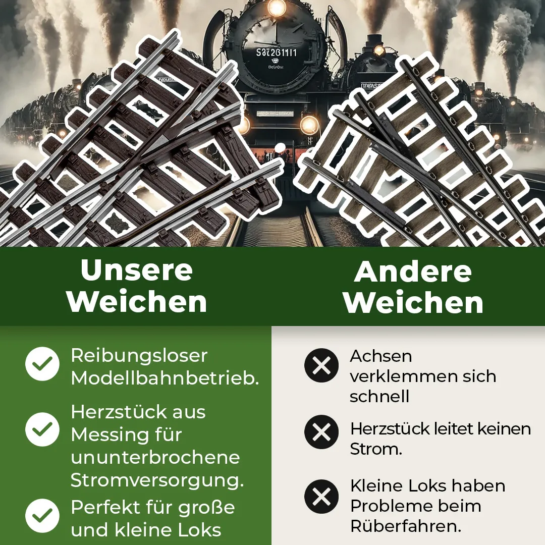Diese vernickelte Bogenweiche mit Linksführung von ML Train kombiniert zwei Radien für eine realistische und zugleich platzsparende Gleisführung. Das vernickelte Profil sorgt im Außenbereich für dauerhafte Stromleitung und ist widerstandsfähig gegenüber Korrosion. Die geschraubte Ausführung bietet hohe strukturelle Stabilität und erleichtert die Wartung. Ein eingebautes Relais übernimmt die Herzstückpolarisierung automatisch. Dadurch bleibt der Stromfluss auch bei langsamer Überfahrt konstant und störungsfrei.