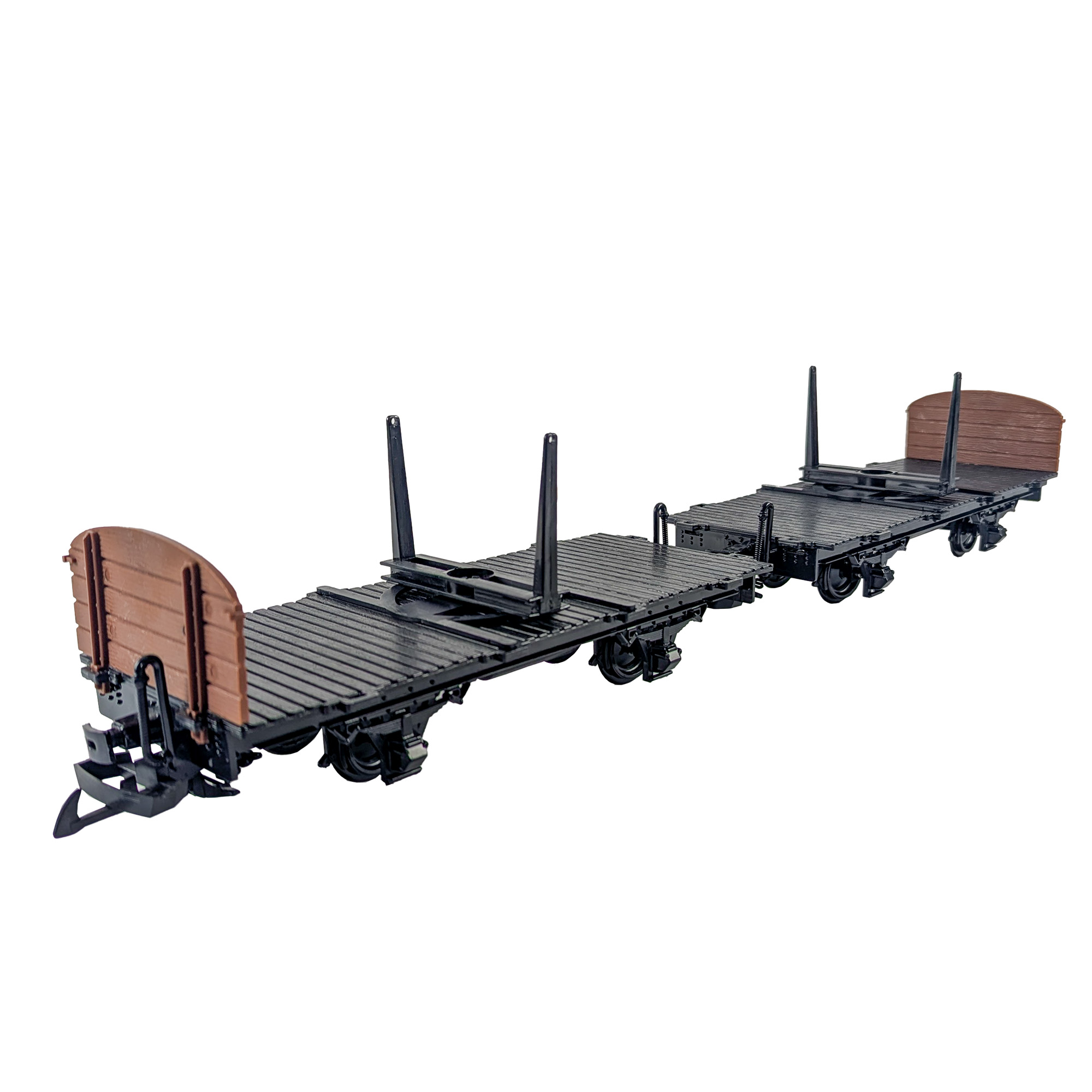 Enthält zwei Drehschemelwagen mit schwarzer Bodenplatte und braunen, abgerundeten kurzen Seitenwänden in Holzoptik. Beide Wagen sind kuppelbar und lassen sich zu realistischen Formationen kombinieren – ideal für Güterzüge und Rangierbetrieb. Modular & klebstoffarm
