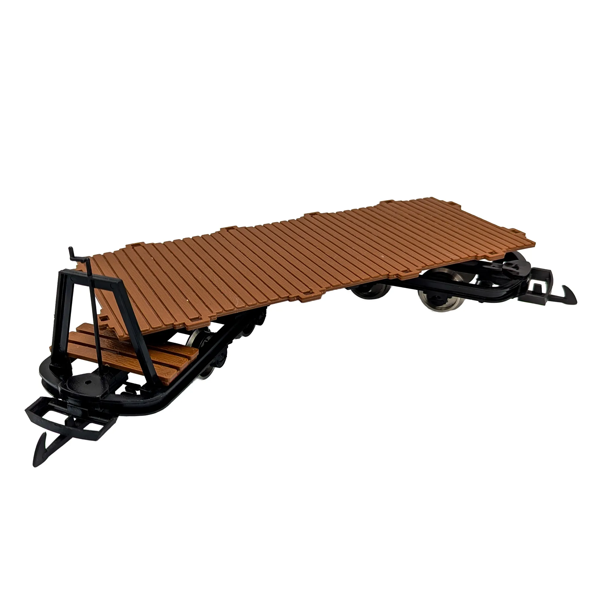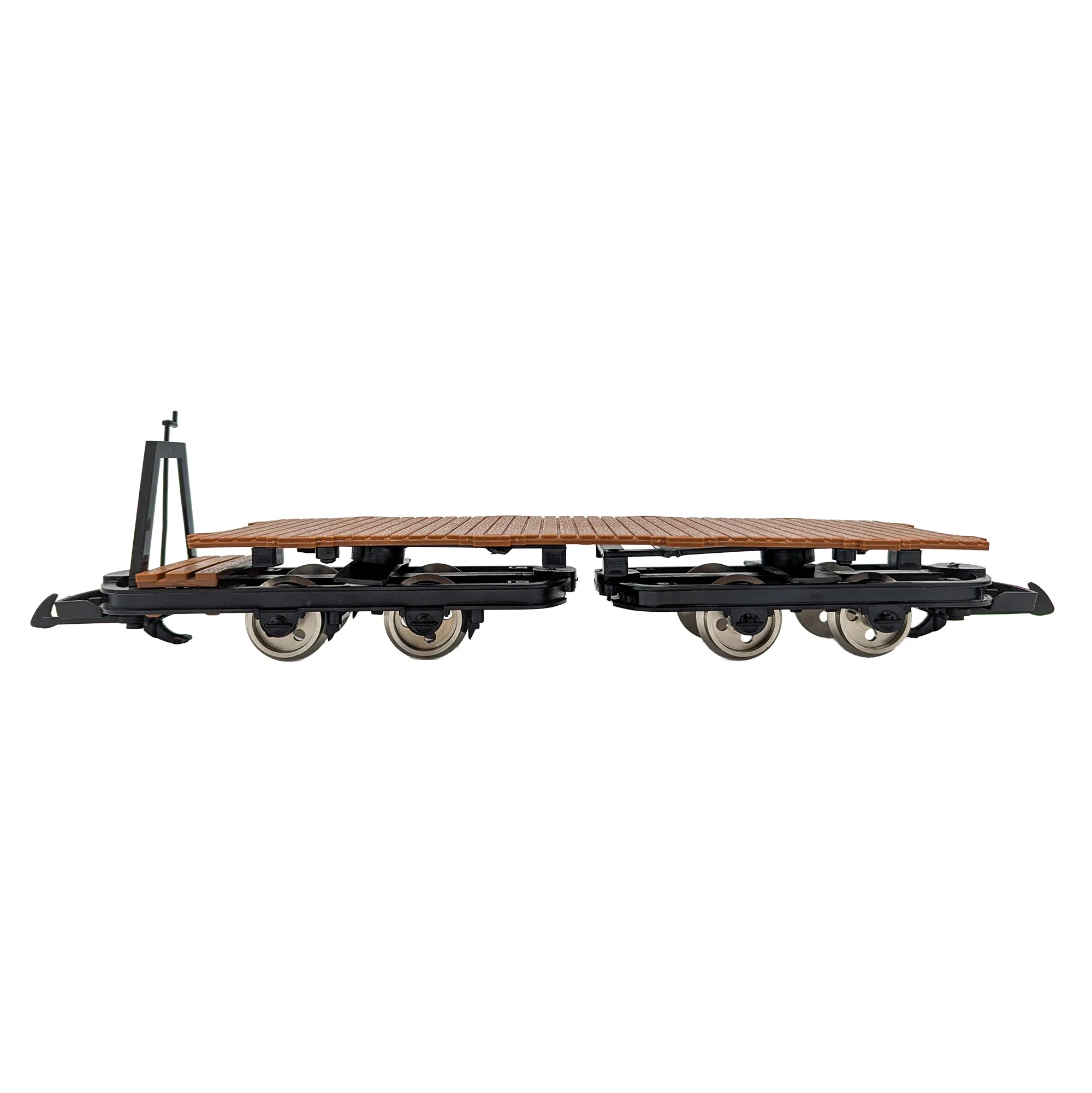 Feldbahn-Flachwagen nach Heeresfeldbahn-Vorbild, mit offener Ladeplattform und zweiteiliger Fahrwerksbasis für hohe Kurvengängigkeit in engen Radien.