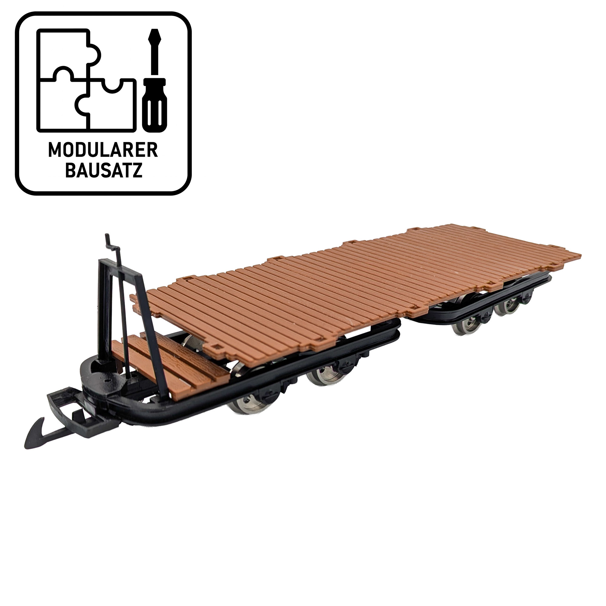 Bauoptionen wie beim Vorbild Vorbildgerechte Erweiterungen sichern den historischen Auftritt des Flachwagens: Mit passenden Komponenten wie steckbaren Seitenwänden und Rungen lässt sich die klassische Heeresfeldbahn-Anmutung nachbilden und bedarfsgerecht variieren. Auf Basis des modularen Bausatzes entstehen wahlweise offene Flachwagen, seitlich eingefasste Ladeflächen oder Rungenwagen – alles auf derselben Plattform. Die dafür benötigten Bauteile sind in der Kategorie Modulare Güterwagen zusammengefasst und erlauben eine individuelle, vorbildnahe Konfiguration.