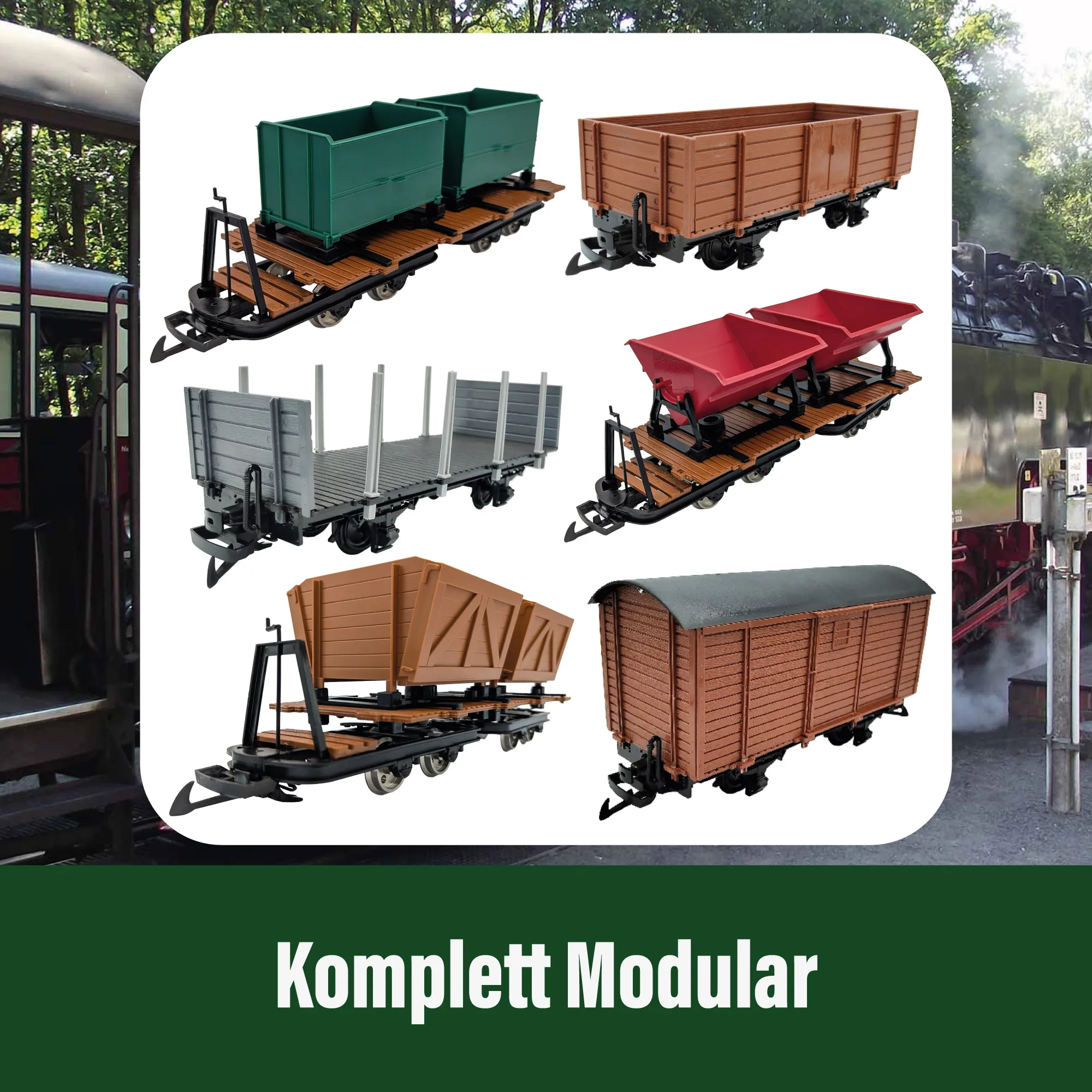 Dank des standardisierten Adaptersystems bleibt die Doppel-Kipplore zukunftsfähig: Farbvarianten, Lastbeispiele und Detailteile lassen sich schrittweise ergänzen, ohne die Basis zu verändern.