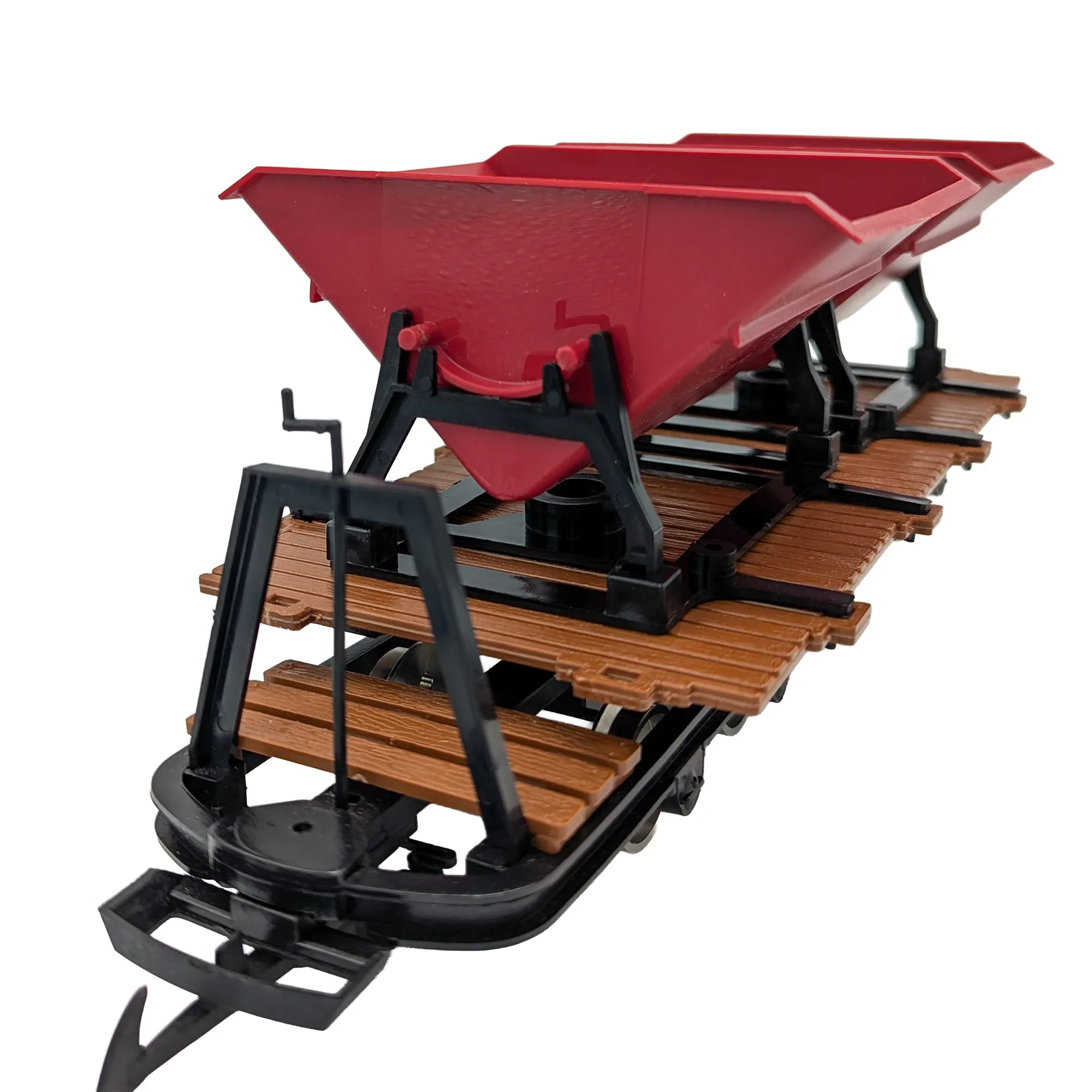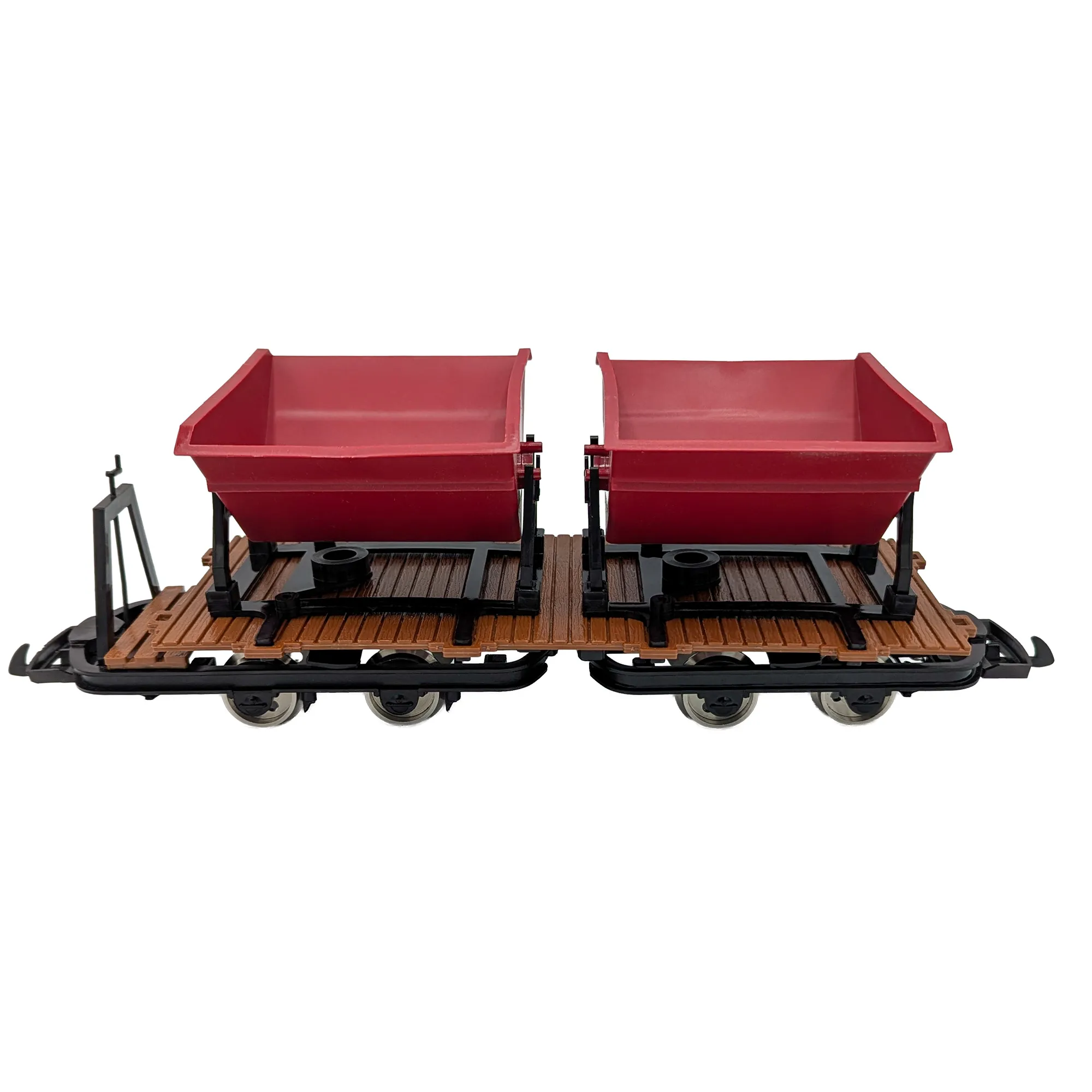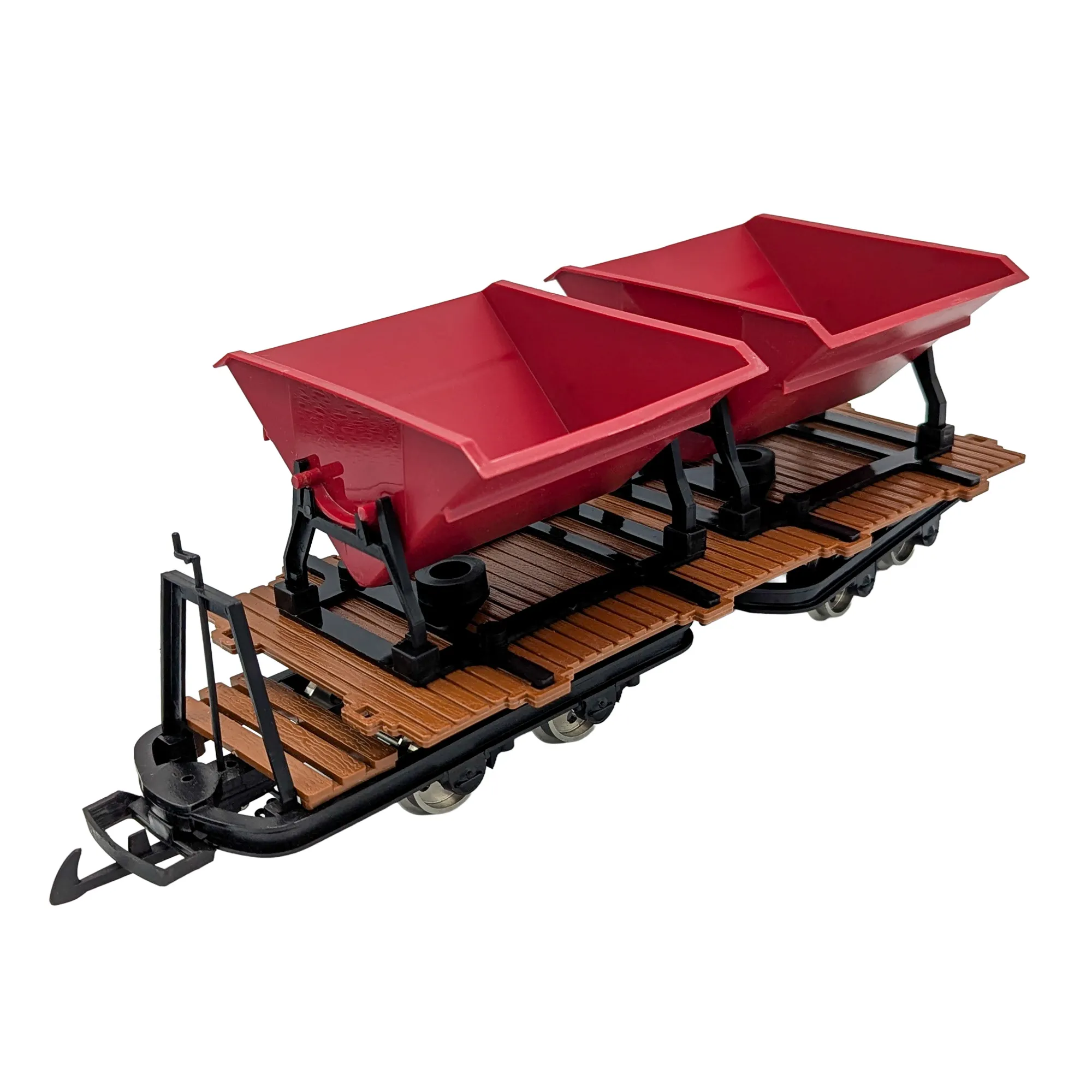 Bausatz-Doppel-Kipplore mit zwei roten Wannen und vier Wannenhaltern. Zweiteilige, drehpunktgelagerte Basis – kurvengängig, sicher, markant. Für dynamische Schüttgutabläufe mit kräftiger Farbwirkung.