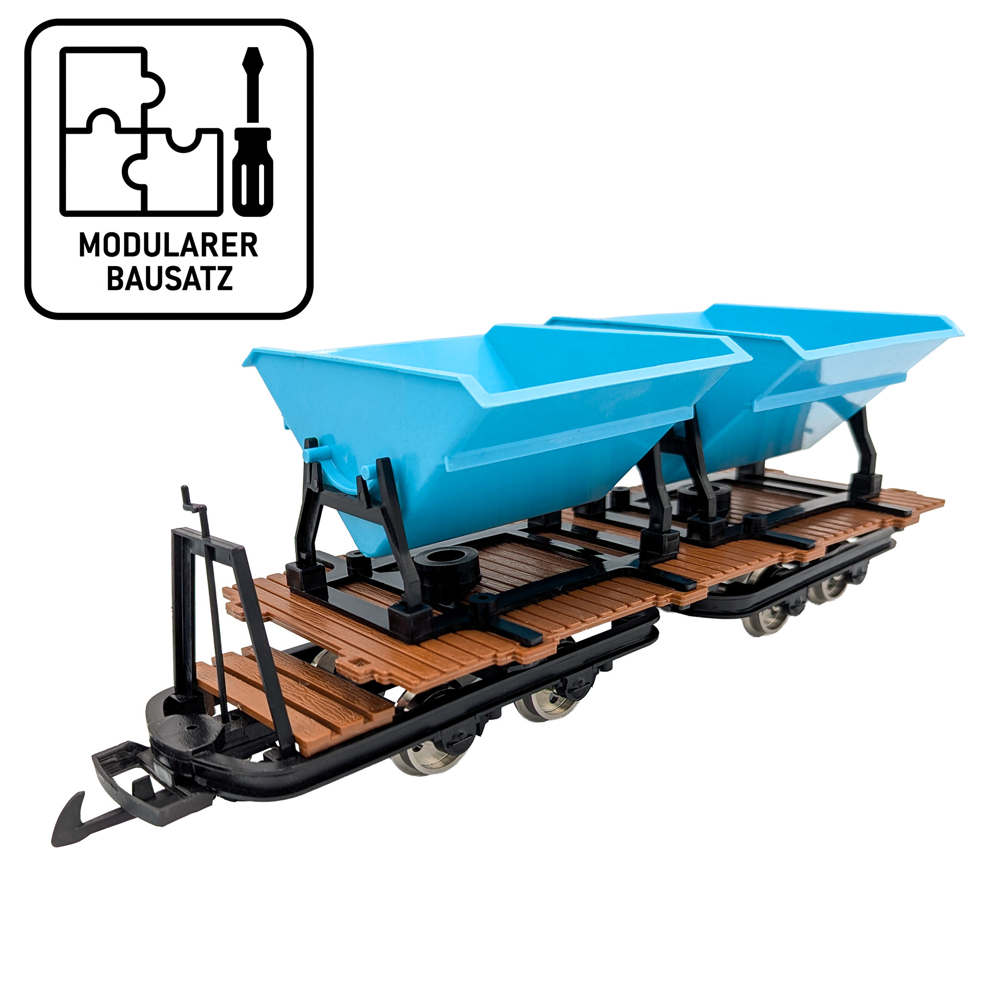 Die Doppel-Kipplore nutzt die Flachwagen-Plattform als Basis und trägt zwei Kipplorenwannen als Aufsatz. Bei Bedarf ist der Umbau auf Rungen- oder Seitenwandbetrieb möglich; Aufbauten lassen sich später austauschen oder ergänzen. Für zwei Wannen sind passende Halter erforderlich.