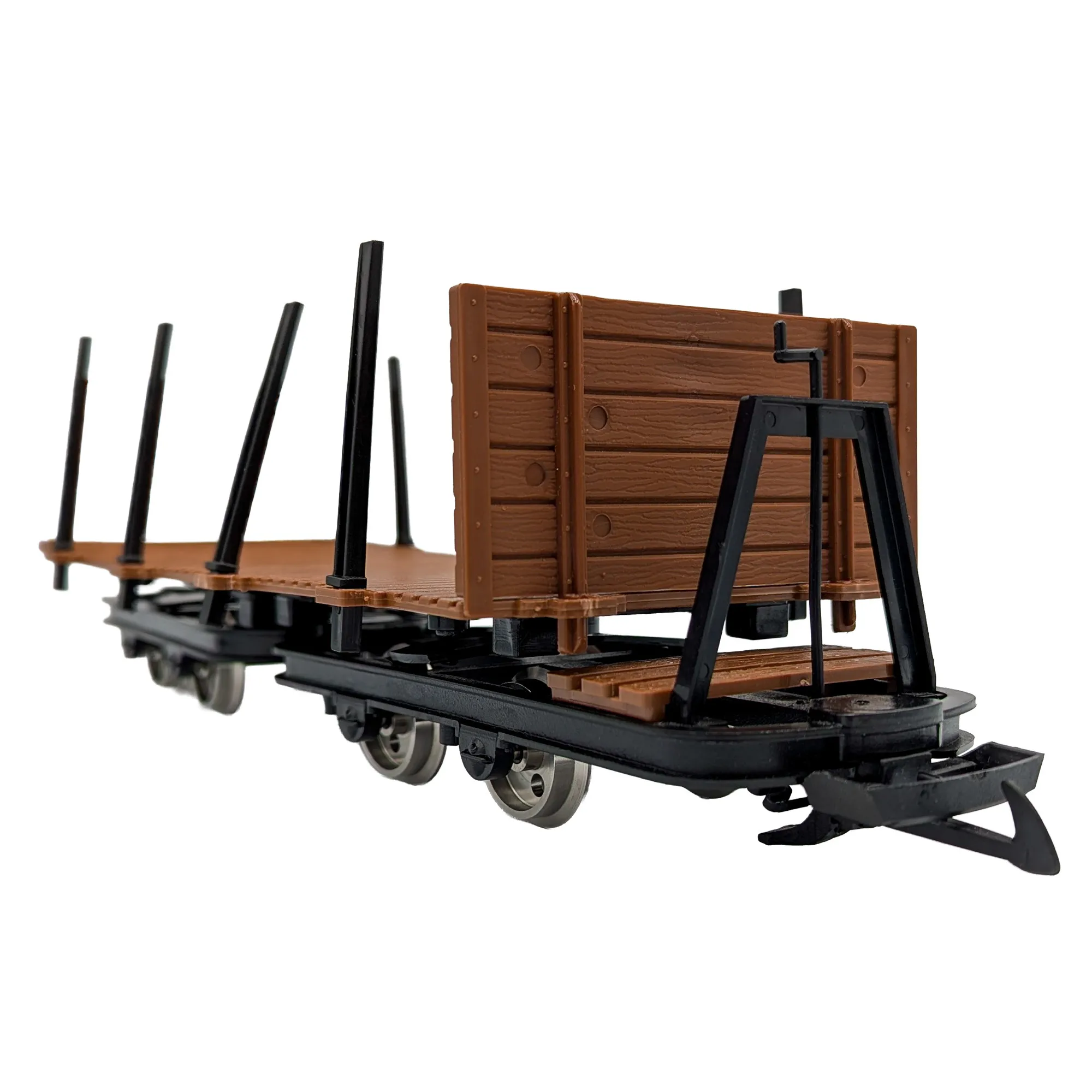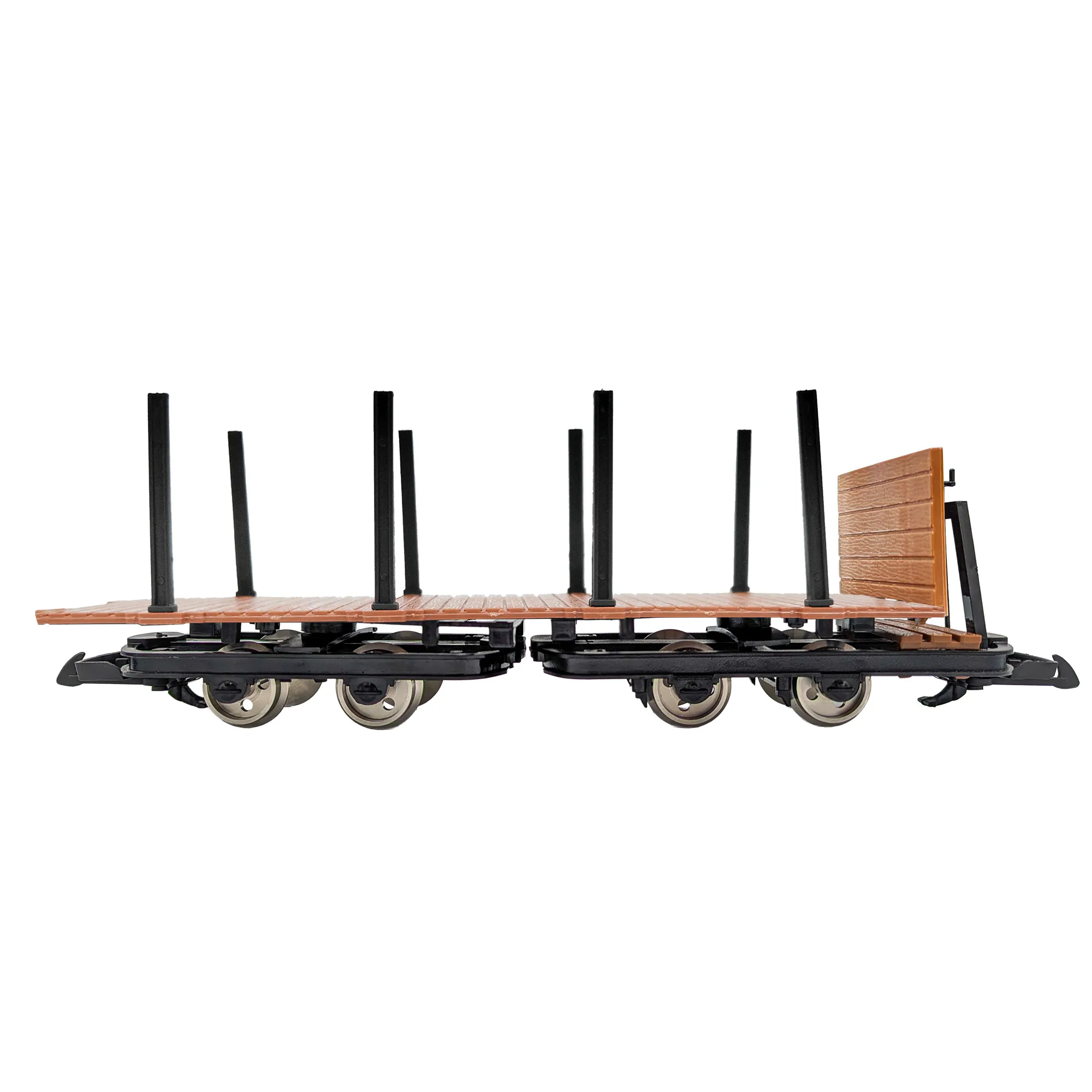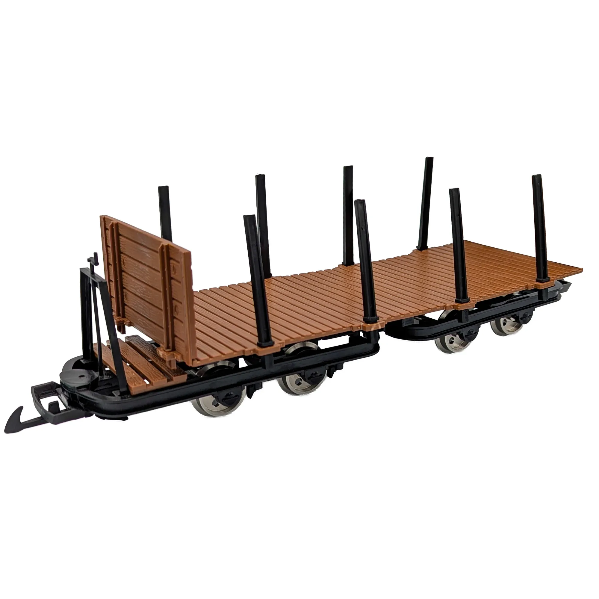 Wagen – Basis und Montage Grundlage ist der zweigeteilte Flachwagen mit zwei eigenständigen Fahrrahmen, die die Plattform über drehbare Lagerpunkte tragen. Diese Bauweise verkürzt den wirksamen Radstand je Gestell, entkoppelt Gleisunebenheiten von der Plattform und sorgt so für ruhigen Rolllauf bei niedriger Ladehöhe. Die durchgehende Holzbohlen-Ladefläche bietet klare Auflagepunkte; definierte Steck-/Schraubpunkte führen die Bauteile präzise und ermöglichen eine klebstofffreie Montage, die auch bei späteren Umbauten wiederholgenau bleibt. Positionierhilfen erleichtern das Ausrichten von Stirnwand und Rungen.