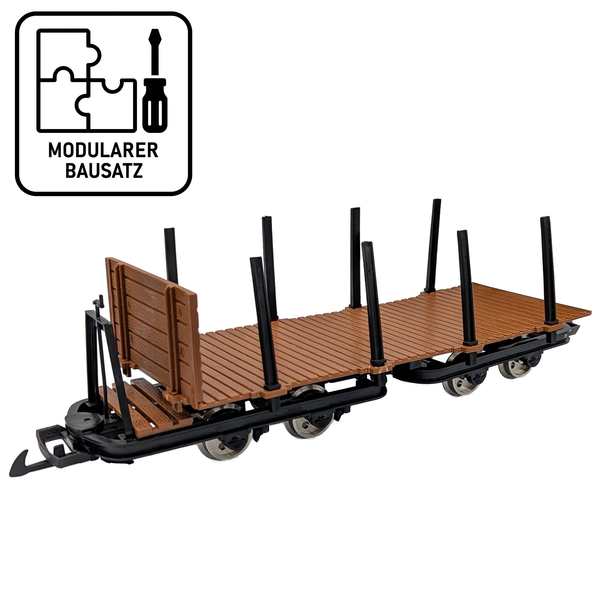 Aus der Flachwagenplattform wird mit steckbaren Rungen ein vorbildgerechter Rungenwagen für Langgut, Stammholz oder Rohrleitungen. Die Ausstattung bleibt variabel und lässt sich jederzeit auf Seitenwände oder andere Aufsätze umstellen; Ergänzungen sind jederzeit möglich.