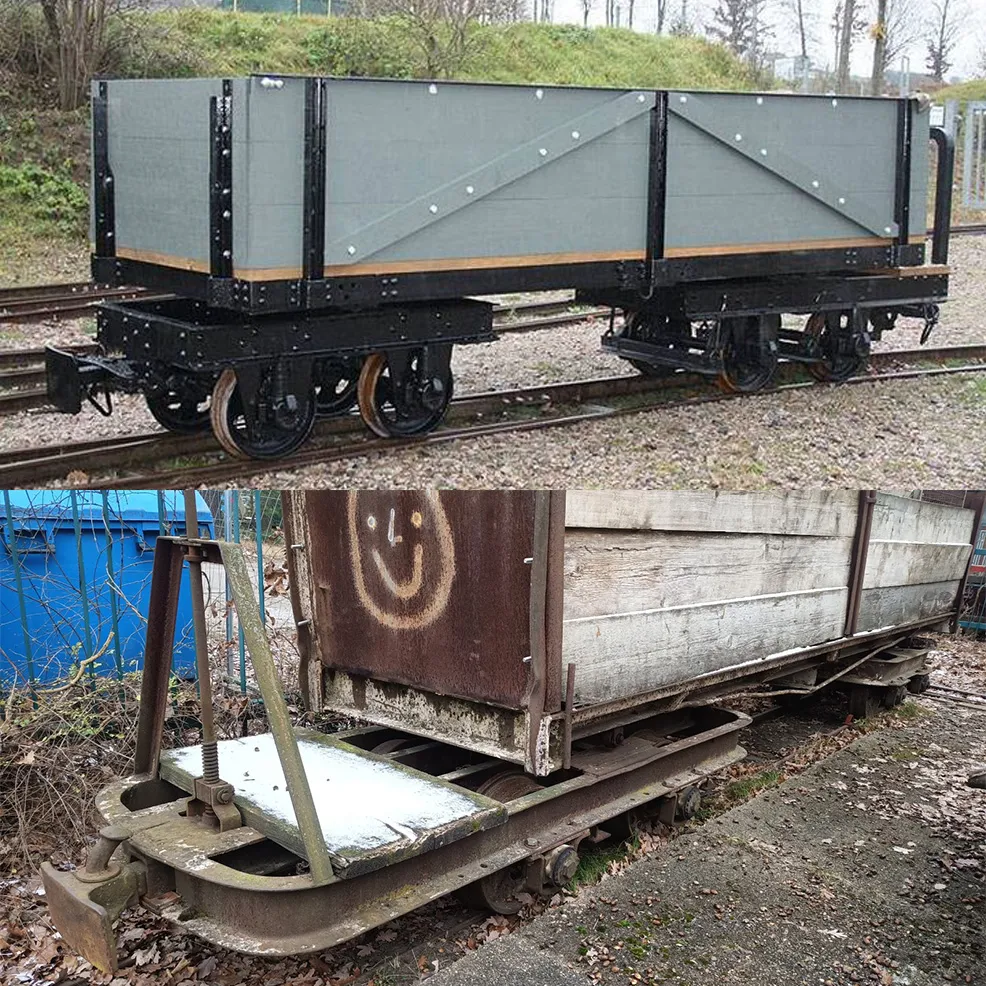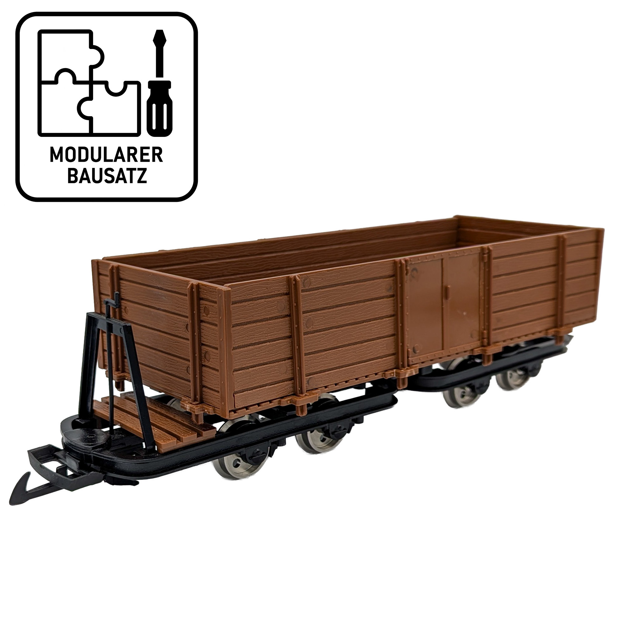 Aus der Flachwagenplattform wird mit hohen Bordwänden ein vorbildgerechter Feldbahn-Hochbordwagen für voluminöse oder rieselfähige Güter wie Torf, Kohle und Schüttgut. Die Ausstattung bleibt modular und lässt sich später auf niedrige Bordwände, Rungen oder andere Aufsätze umrüsten.