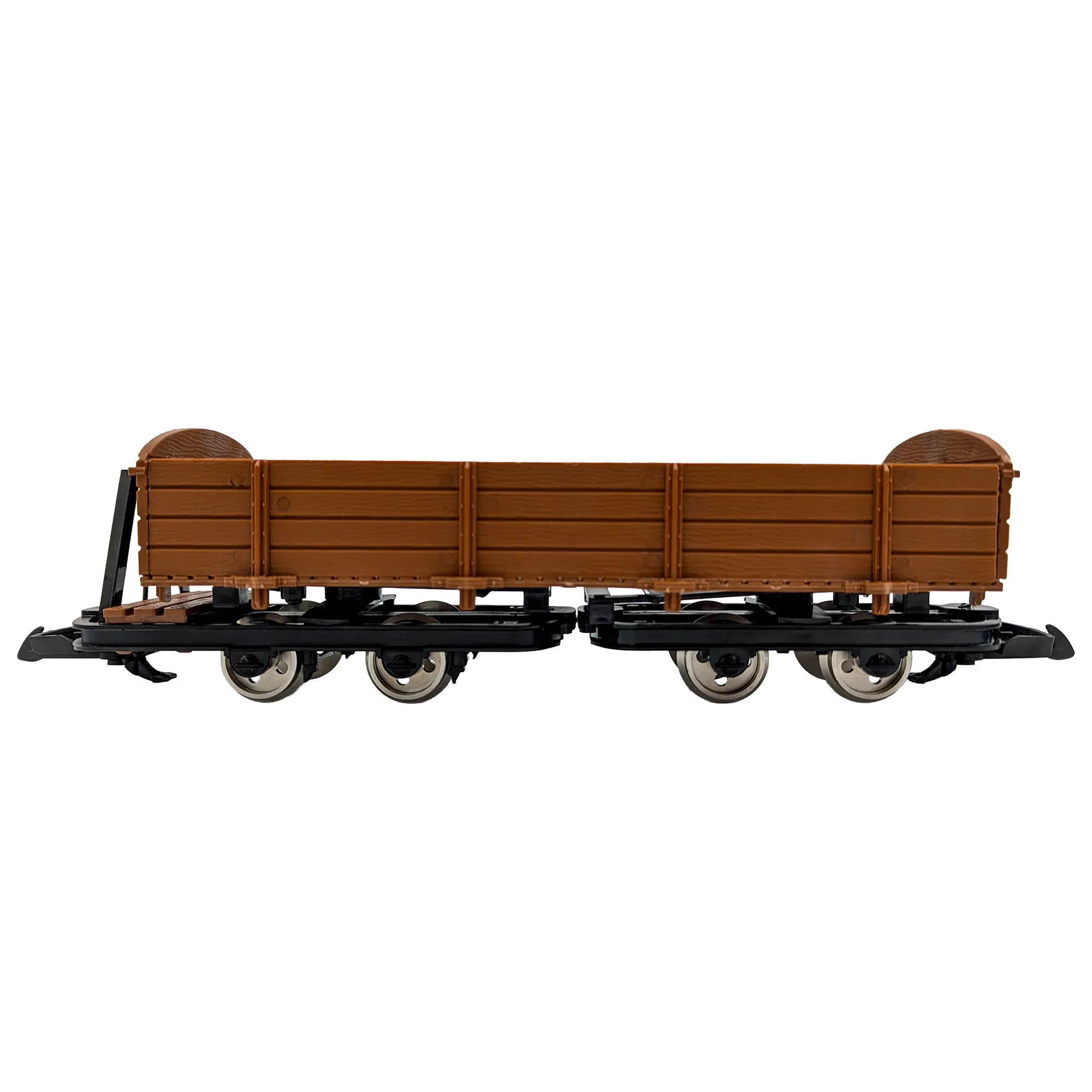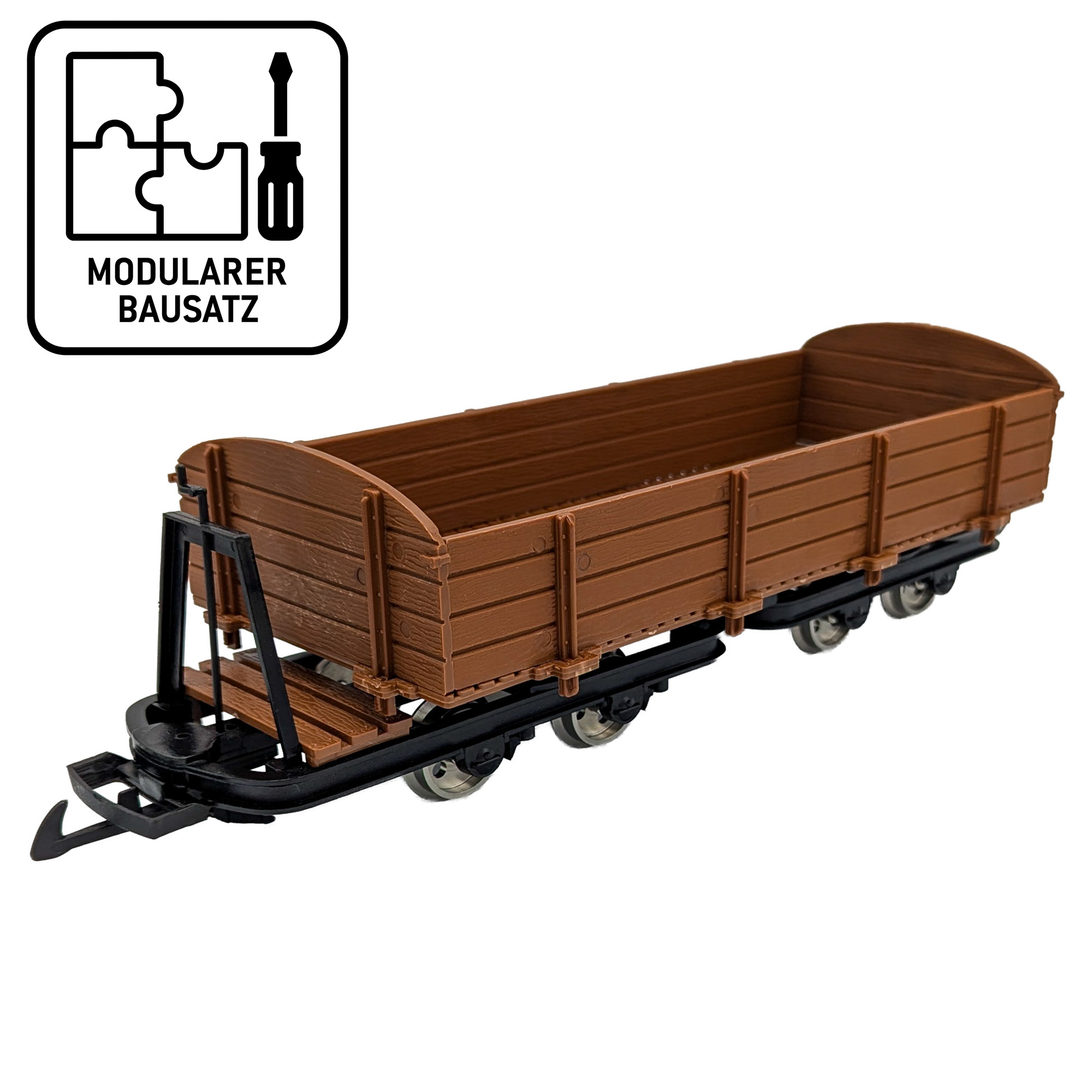 Wagenset – Basis und Montage Das Fundament bildet eine zweigeteilte Fahrwerksbasis: Zwei eigenständige Feldbahn-Fahrrahmen – einer mit Bremserbühne – tragen die Plattform über drehbare Lagerpunkte. Diese Bauart verkürzt den wirksamen Radstand je Gestell und hält den Lauf auch bei niedrigen Geschwindigkeiten ruhig; die Drehpunkte entkoppeln Gleistorsionen, reduzieren Verspannungen im Aufbau und schonen Ladung wie Verbindungen bei wechselnden Gleiszuständen. Die Bremserbühne setzt einen vorbildnahen Akzent und ermöglicht glaubwürdige Szenen beim Sichern, Lösen und Umsetzen. Die Montage erfolgt über definierte Steck-/Schraubpunkte klebstofffrei, bleibt servicefreundlich und wiederholgenau.