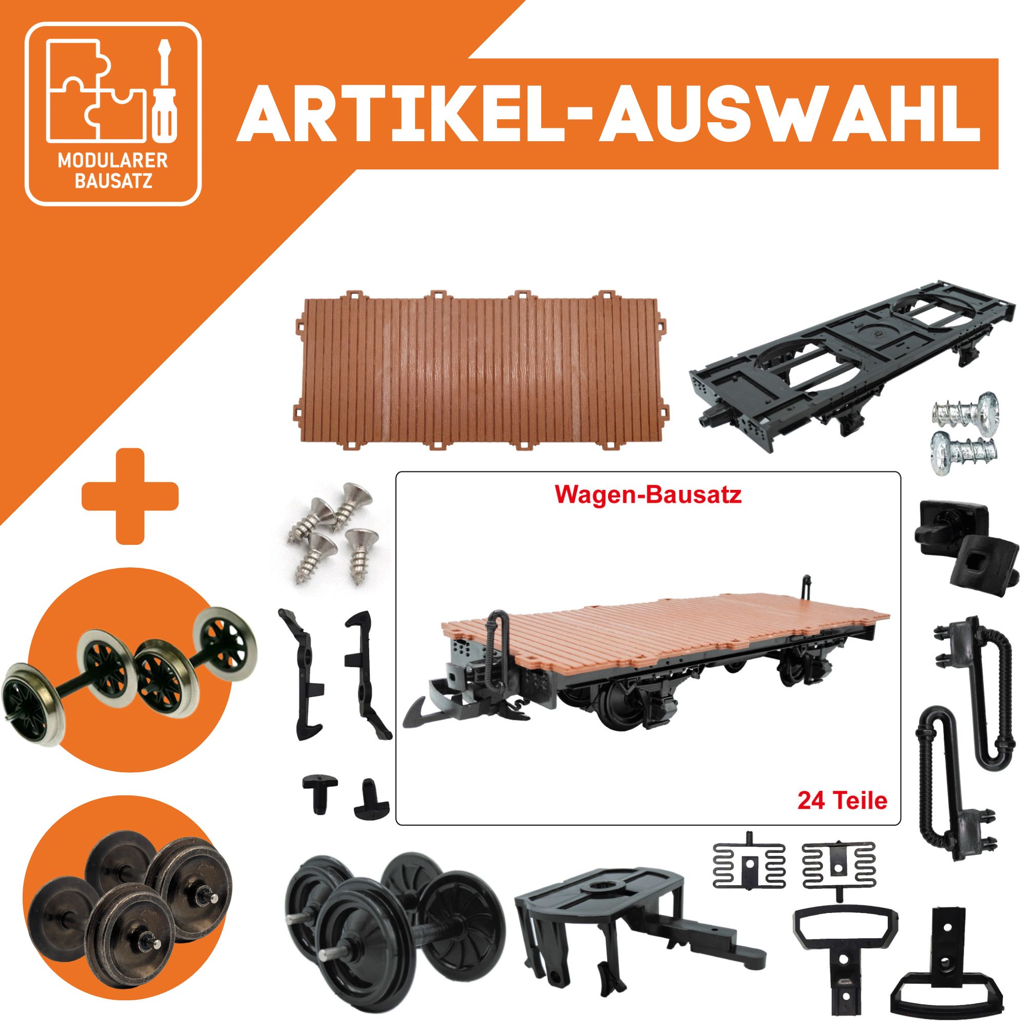 Brauner Flachwagen als Spur-G Bausatz: stabiler Plattformrahmen, modular konfigurierbar, Varianten mit unterschiedlichen Radsätzen.