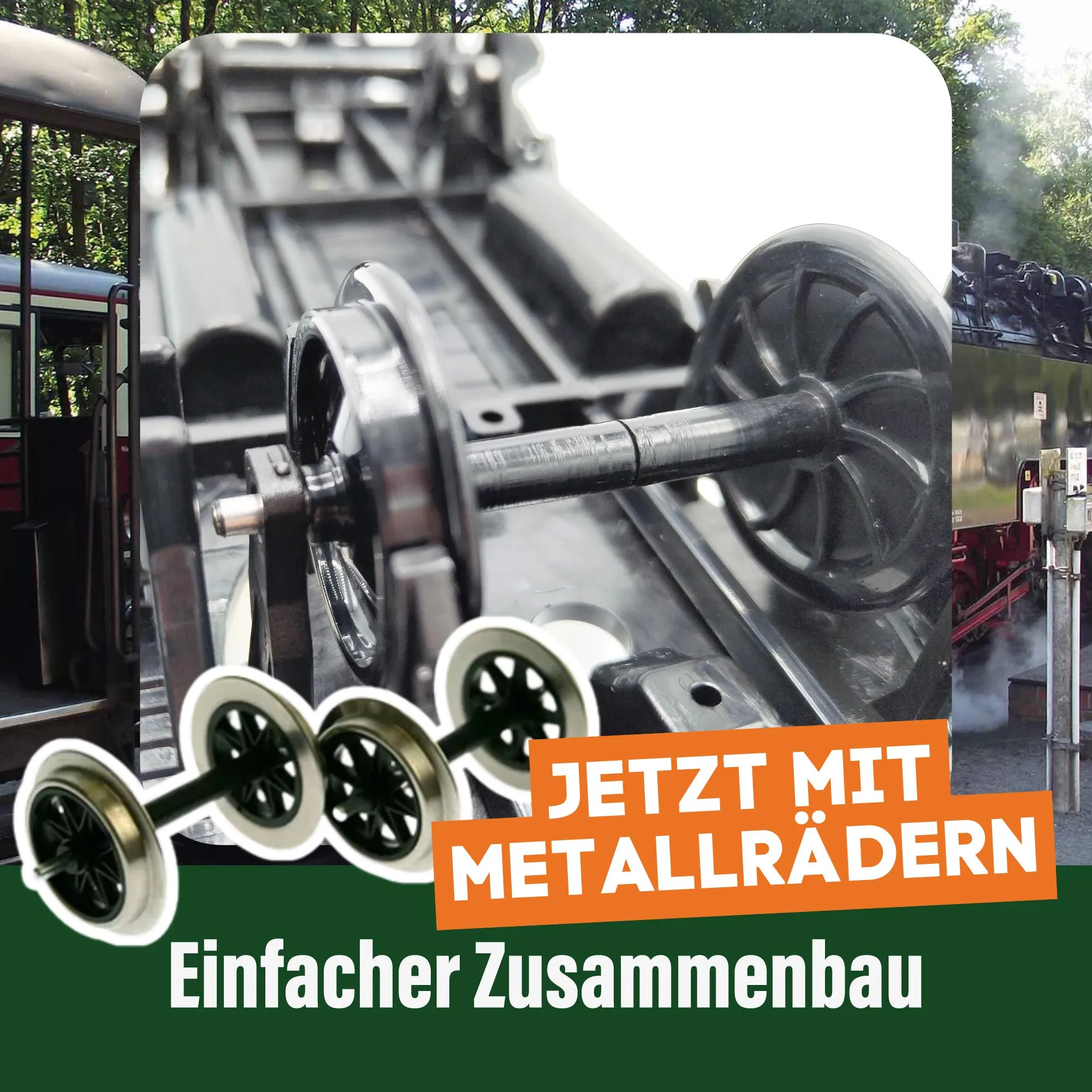 Ab sofort wird unser bewährter Spur-G-Bausatz mit hochwertigen Metallradsätzen in eleganter Doppelspeichen-Optik ausgeliefert. Diese sorgen für spürbar bessere Laufeigenschaften, zusätzliches Gewicht und ein besonders vorbildgetreues Erscheinungsbild im Modellbetrieb. Die modulare Bauweise bleibt unverändert und ermöglicht weiterhin eine schnelle, saubere Montage ohne Klebstoff.