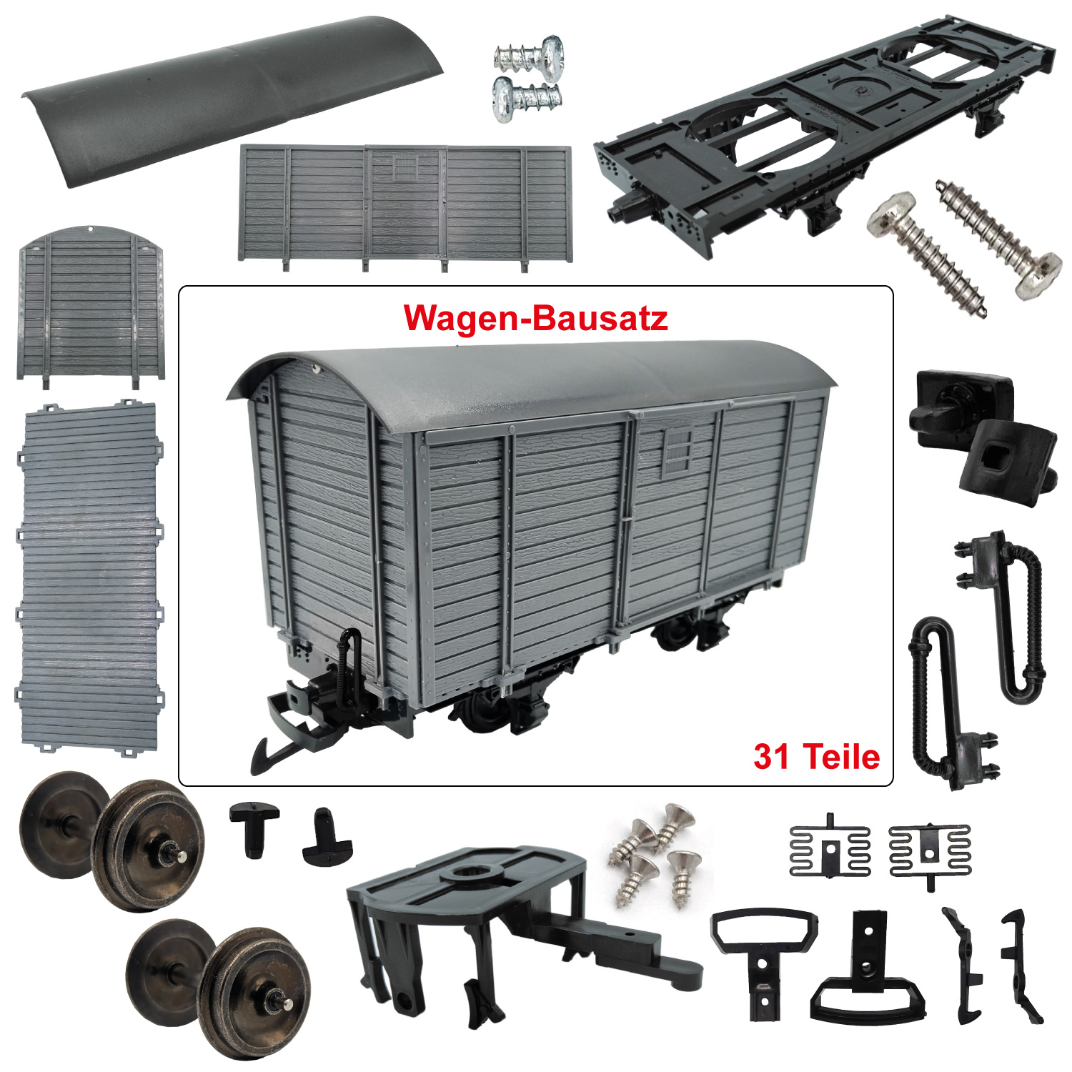 Der Bausatz für den gedeckten Güterwagen in Grau umfasst insgesamt 31 Einzelteile, wobei der Zusammenbau dank der ausführlichen Bauanleitung als relativ unkompliziert erlebt wird.