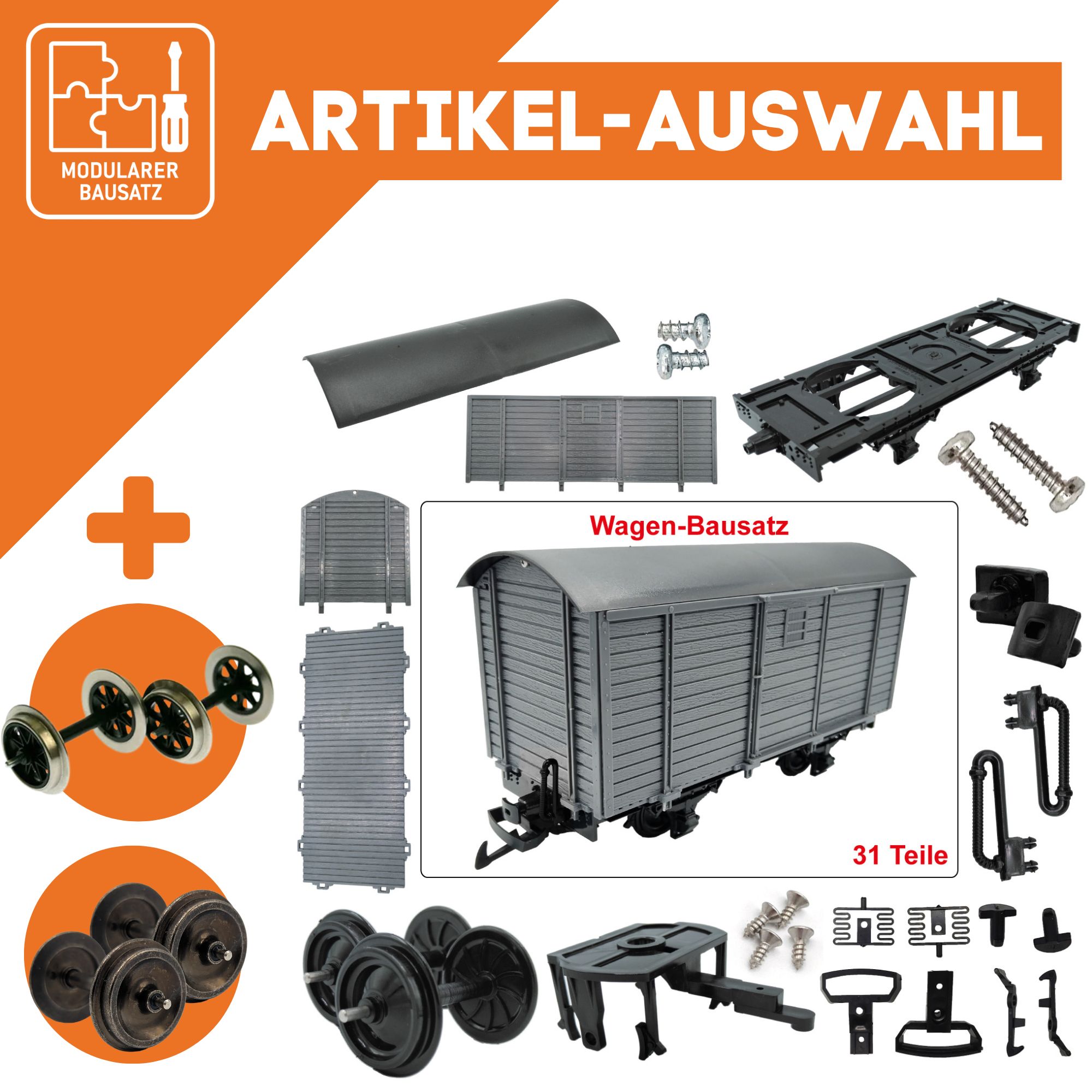 Der Bausatz für den gedeckten Güterwagen in Grau umfasst insgesamt 31 Einzelteile, wobei der Zusammenbau dank der ausführlichen Bauanleitung als relativ unkompliziert erlebt wird.