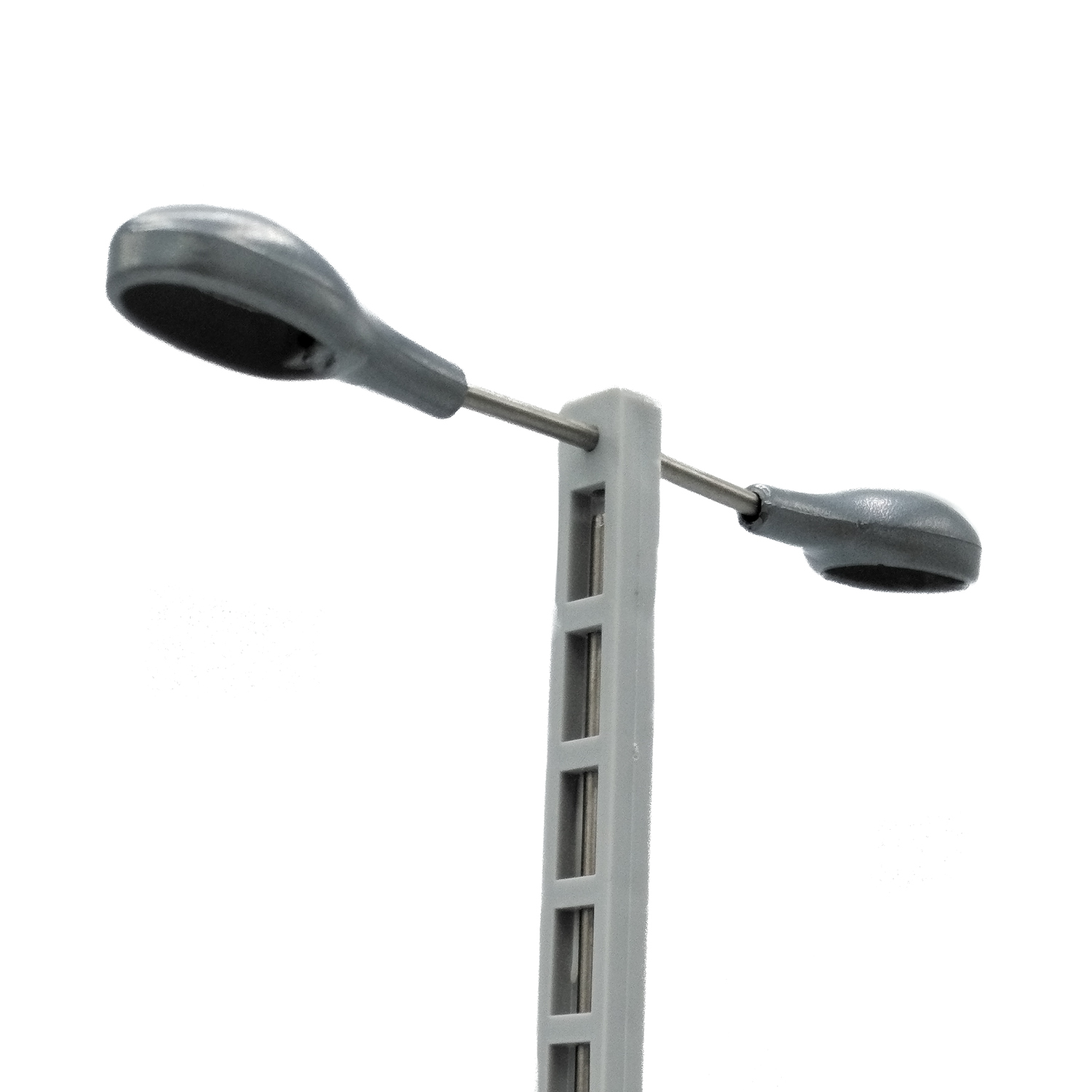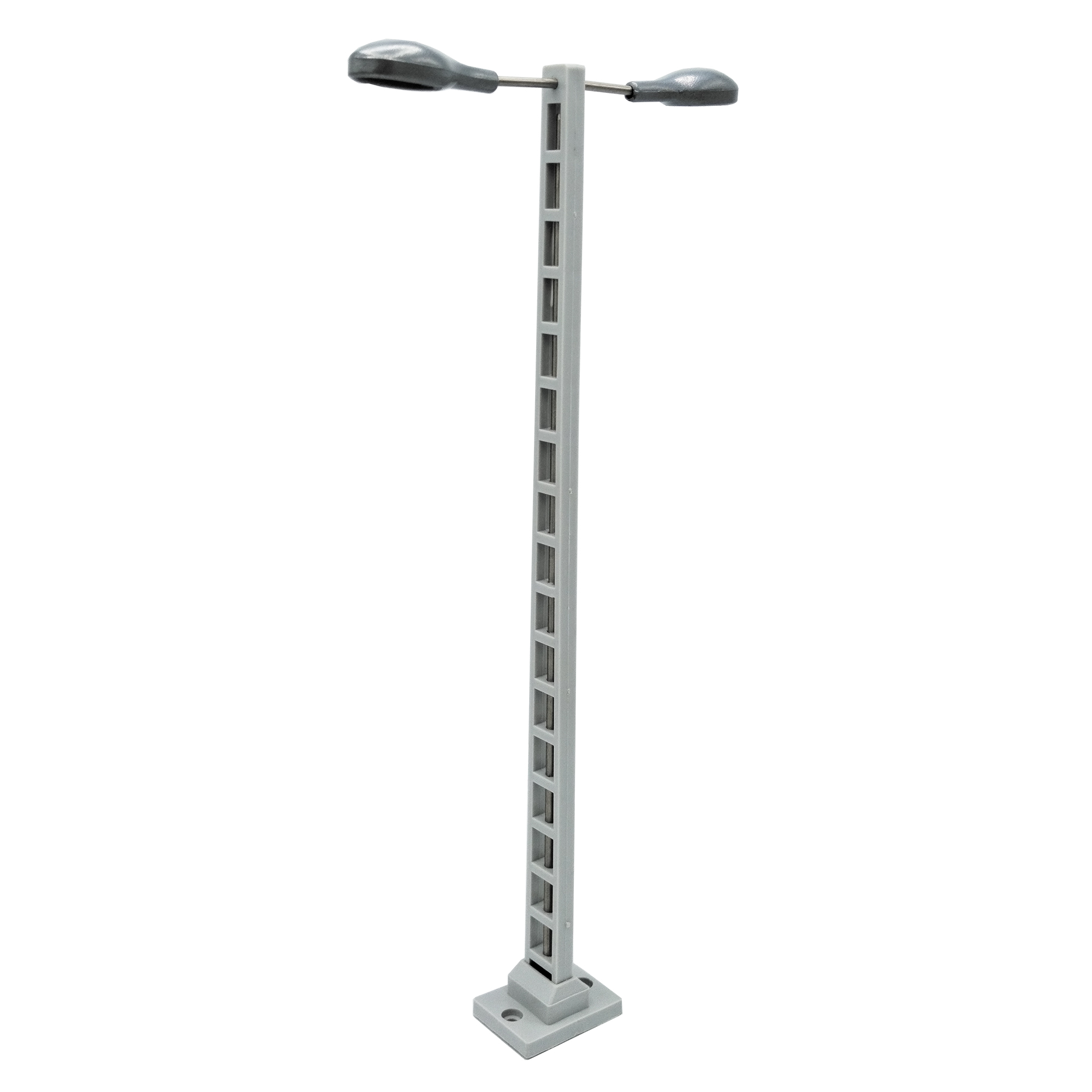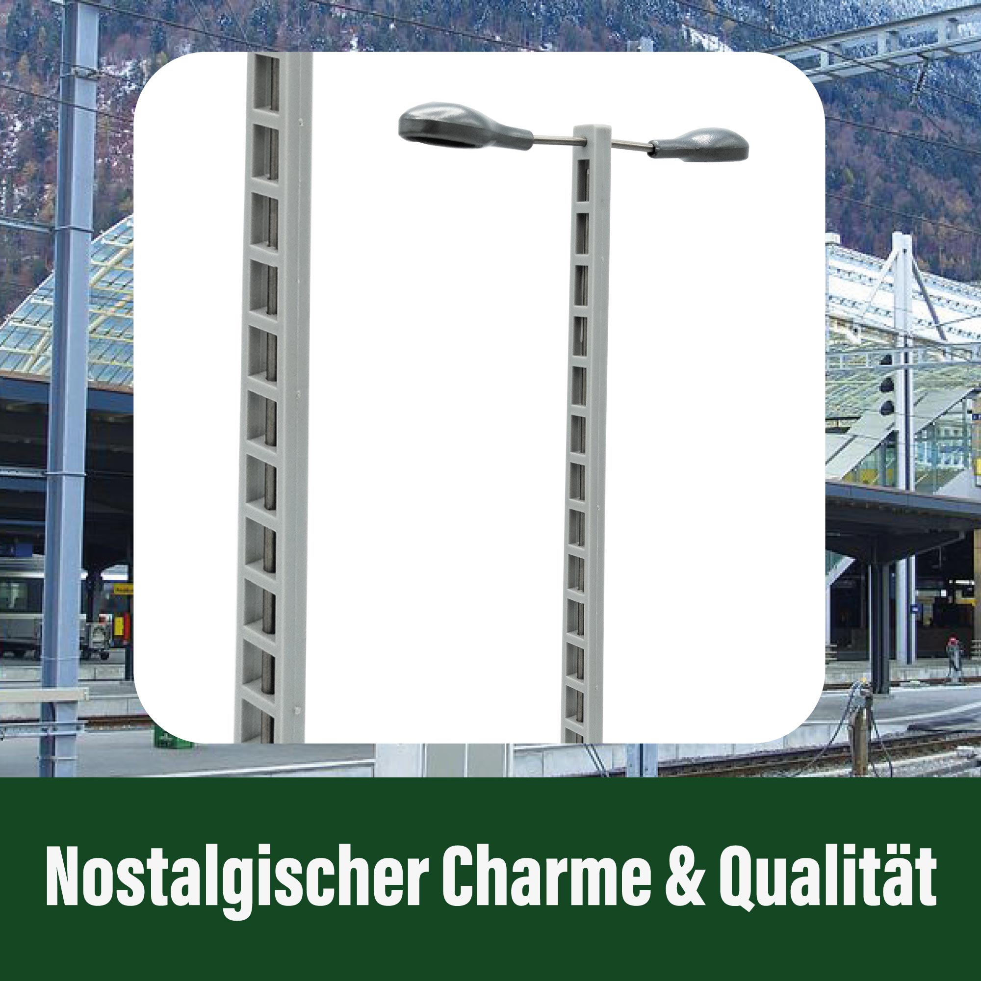 Die Leuchte zeichnet sich durch ihr historisch inspiriertes Design aus, das Ihre Modellbahnanlage mit einem Hauch von Nostalgie und Authentizität bereichert. Die zweiflammige Konstruktion sorgt nicht nur für eine realistische Beleuchtung, sondern unterstreicht auch die Liebe zum Detail in der Gestaltung Ihrer Modellbahnlandschaft.
