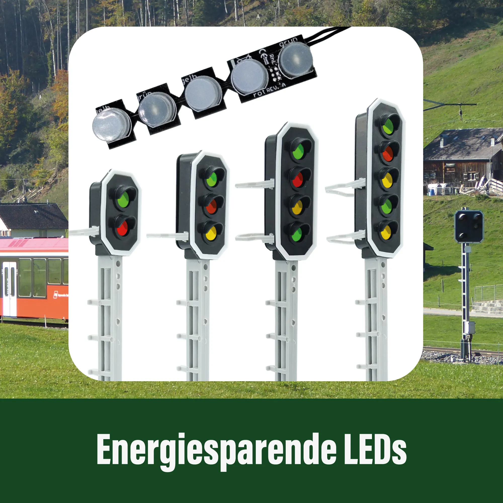 Dieses Set vereint RhB Typ-L-Lichtsignale, Vorsignale und moderne Zwergsignale der Schweizer Bahnen zu einem harmonischen Gesamtpaket, das vorbildgerechte Fahrstraßen auch auf kompakten Spur-G-Anlagen ermöglicht. Die Vorsignale kündigen frühzeitig an, welches Bild das nachfolgende Typ-L-Hauptsignal zeigen wird, und unterstützen dadurch eine vorausschauende und gleichmäßige Zugführung. Die mehrbegriffigen Hauptsignale regeln Ein- und Ausfahrten sowie Geschwindigkeitszustände, während die bodennah montierten Zwergsignale die Rangierwege strukturieren und Weichenfelder, Abstellbereiche oder Anschlussgleise sichern. So entsteht eine klare Trennung zwischen Zugverkehr und Rangierbetrieb, die sich selbst auf kleinen Anlagenabschnitten nachvollziehbar und nah am Vorbild abbilden lässt.
