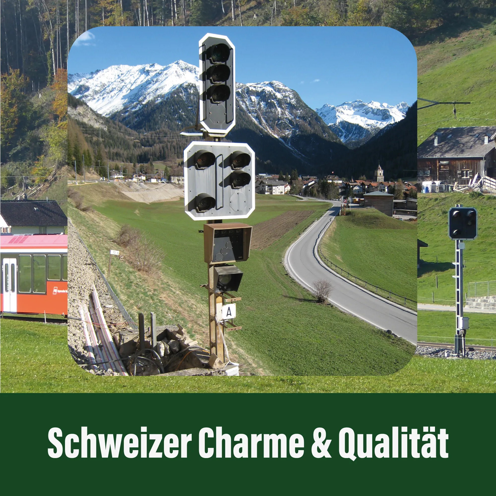 Die Bauweise orientiert sich konsequent am Vorbild der RhB und kombiniert technische Funktionalität mit optischer Präzision. Das Ergebnis ist ein klar strukturiertes Signalsystem mit hohem Wiedererkennungswert und Modelltreue.