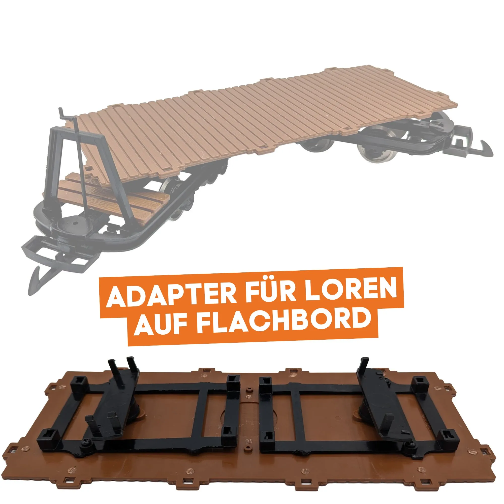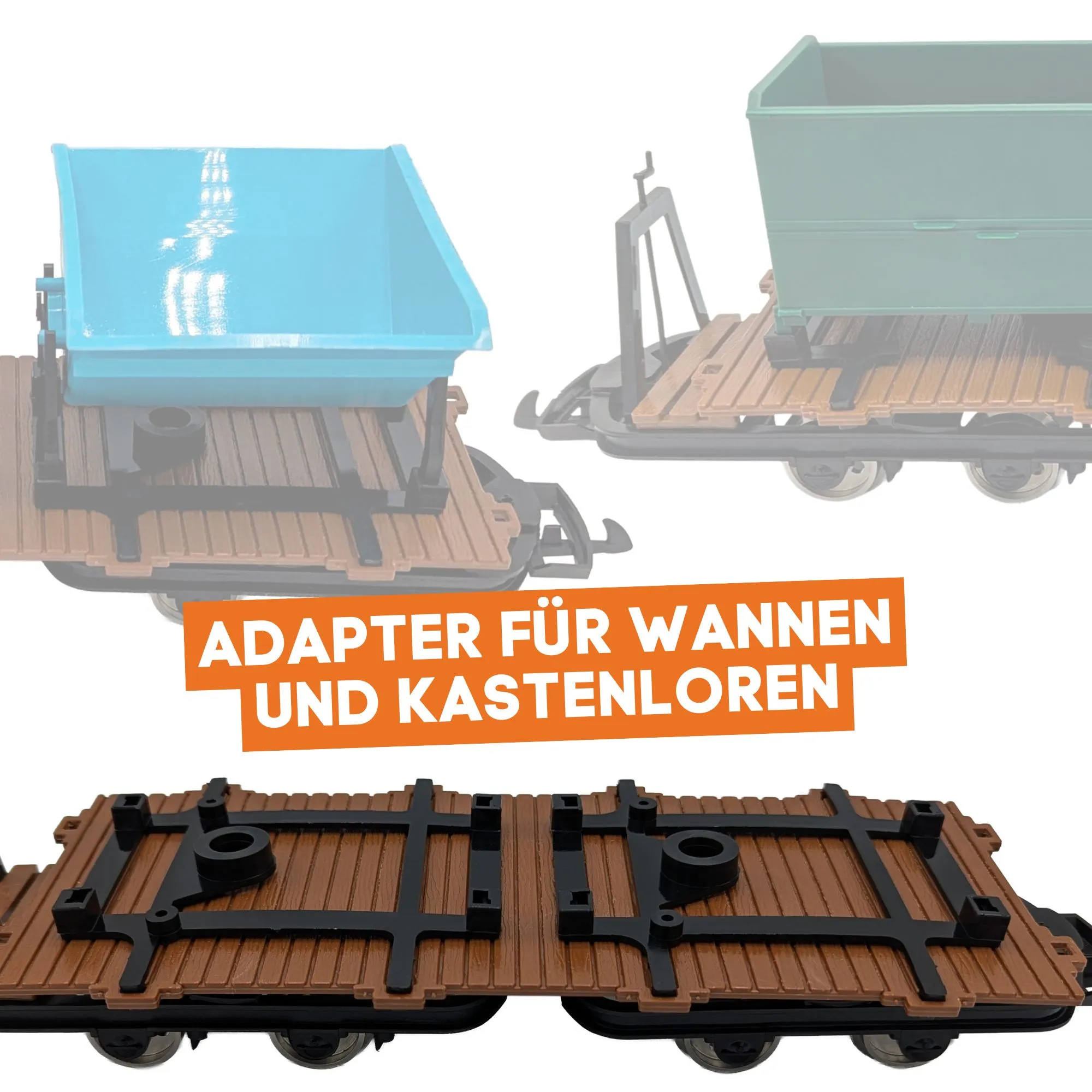 Der Lorenadapter dient als vielseitiger Adapterrahmen aus schwarzem, formstabilem Präzisionskunststoff und ermöglicht die schnelle Umrüstung von Flachwagen auf unterschiedliche Lorenaufbauten. Integrierte, definierte Aufnahmepunkte erlauben die sichere, verdrehsichere Montage von Lorenwannen mit Wannenhalter sowie von Kasten- und Torflorenaufsätzen. Der Einsatz erfolgt auf Flachwagen mit ebener Ladefläche und geeigneten Befestigungspunkten; kompatibel unter anderem mit den Bodenplatten