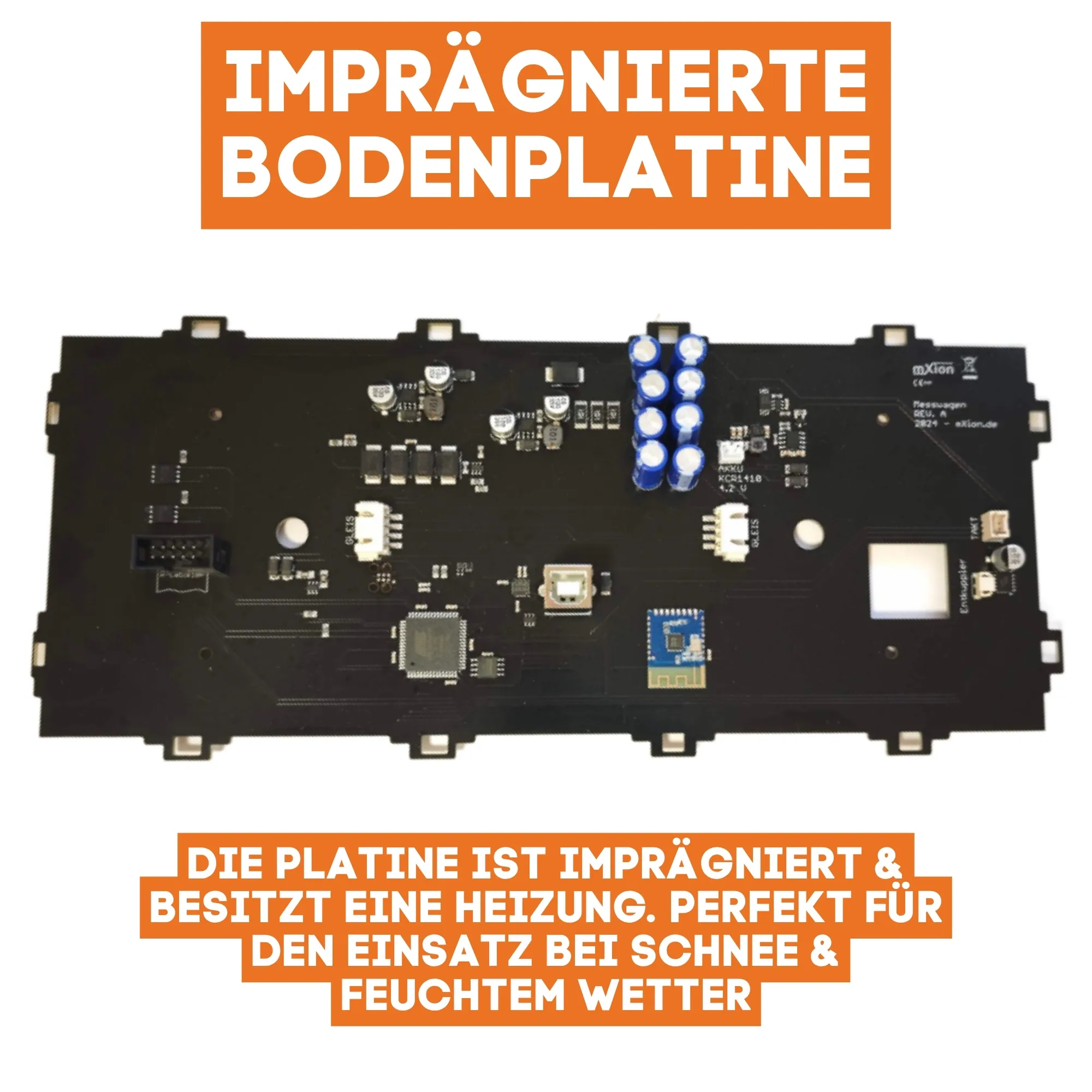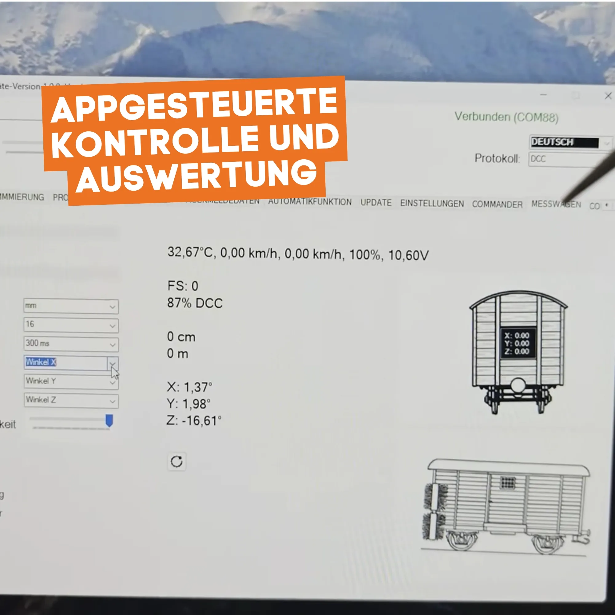 Messfunktion im FokusDie Bodenplatte wird durch eine Elektronik-Platine ersetzt – der Wagen wird zum mobilen Messlabor. Ein starker Prozessor verarbeitet Signale von Taktsensor und 3-Achs-Gyroskop in Echtzeit und liefert exakte Angaben zu Geschwindigkeit (real und skaliert), Neigung und Lage. Parallel überwacht die Bordelektronik die Gleisspannung und zeigt alle Werte unmittelbar am Front-OLED. So werden neue Abschnitte präzise eingemessen, Kontaktprobleme zielsicher gefunden und Steigungen, Übergänge sowie Kurven objektiv bewertet – während der Fahrt und ohne zusätzliche Geräte.