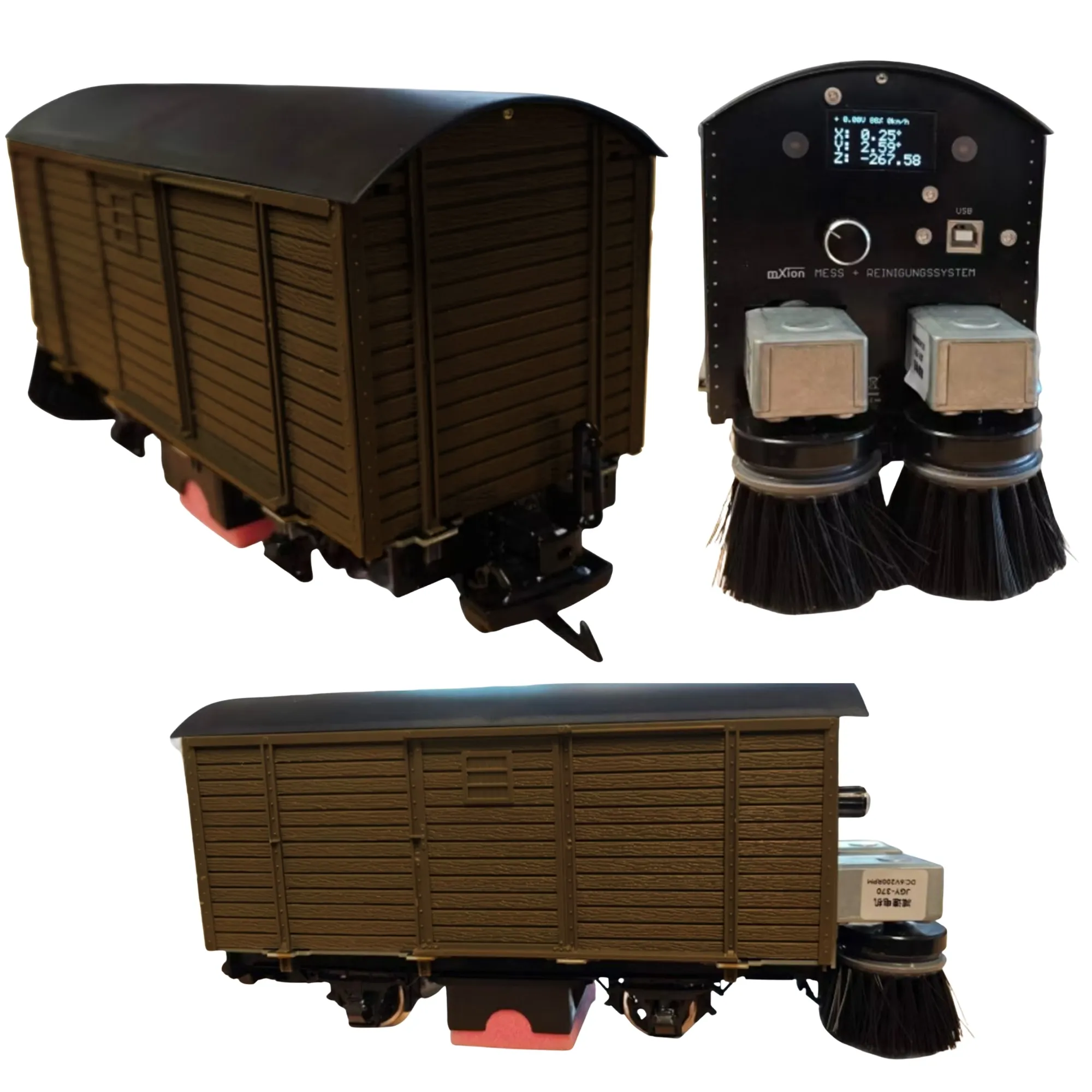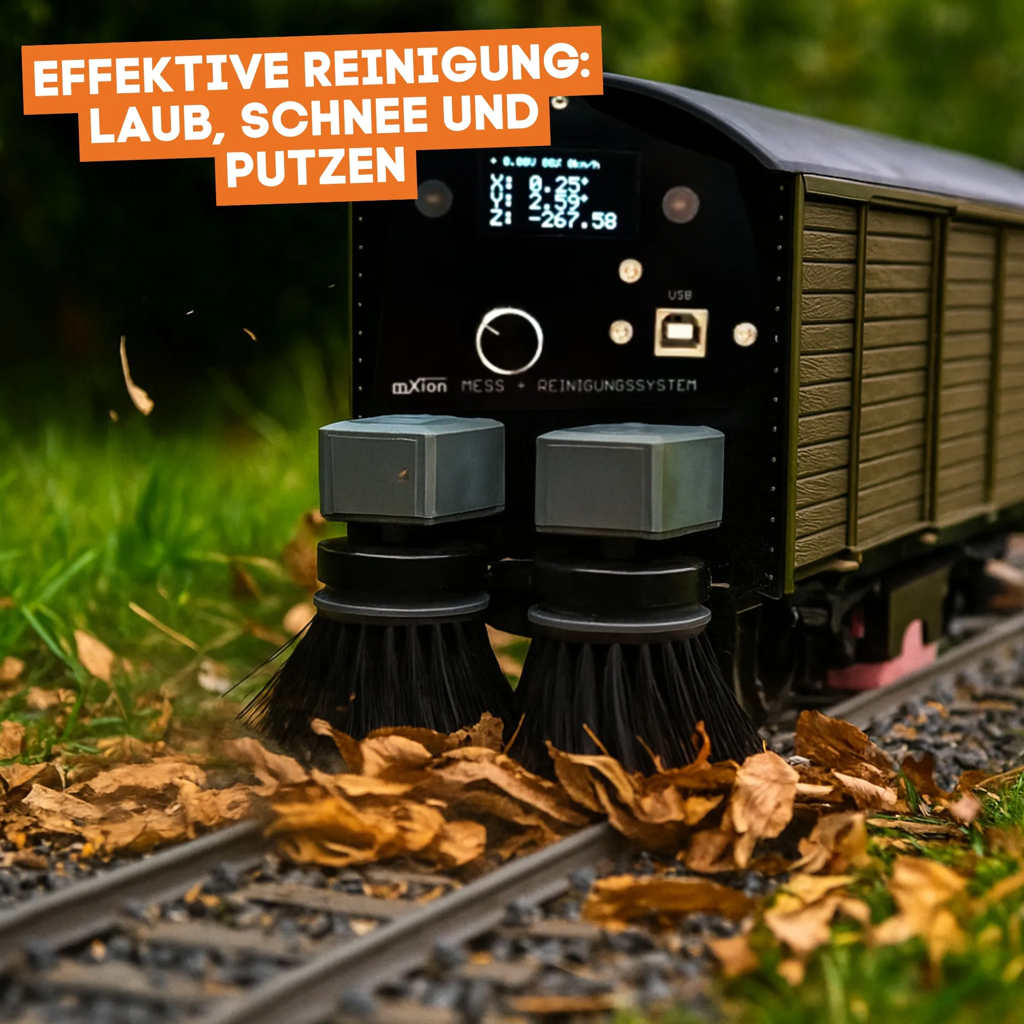 Einsatz & SteuerungVorne arbeiten zwei rotierende Bürsten gegen Schnee, Laub und grobe Partikel, unten sorgt ein Schwammreiniger für die schonende Nachpflege der Schienenoberflächen. Kugelgelagerte Achsen mit Stromabnahme gewährleisten leichten Lauf und sichere Energieversorgung, damit Reinigung und Messung ohne Unterbrechung gelingen – optisch passend im braunen Güterzugverband.