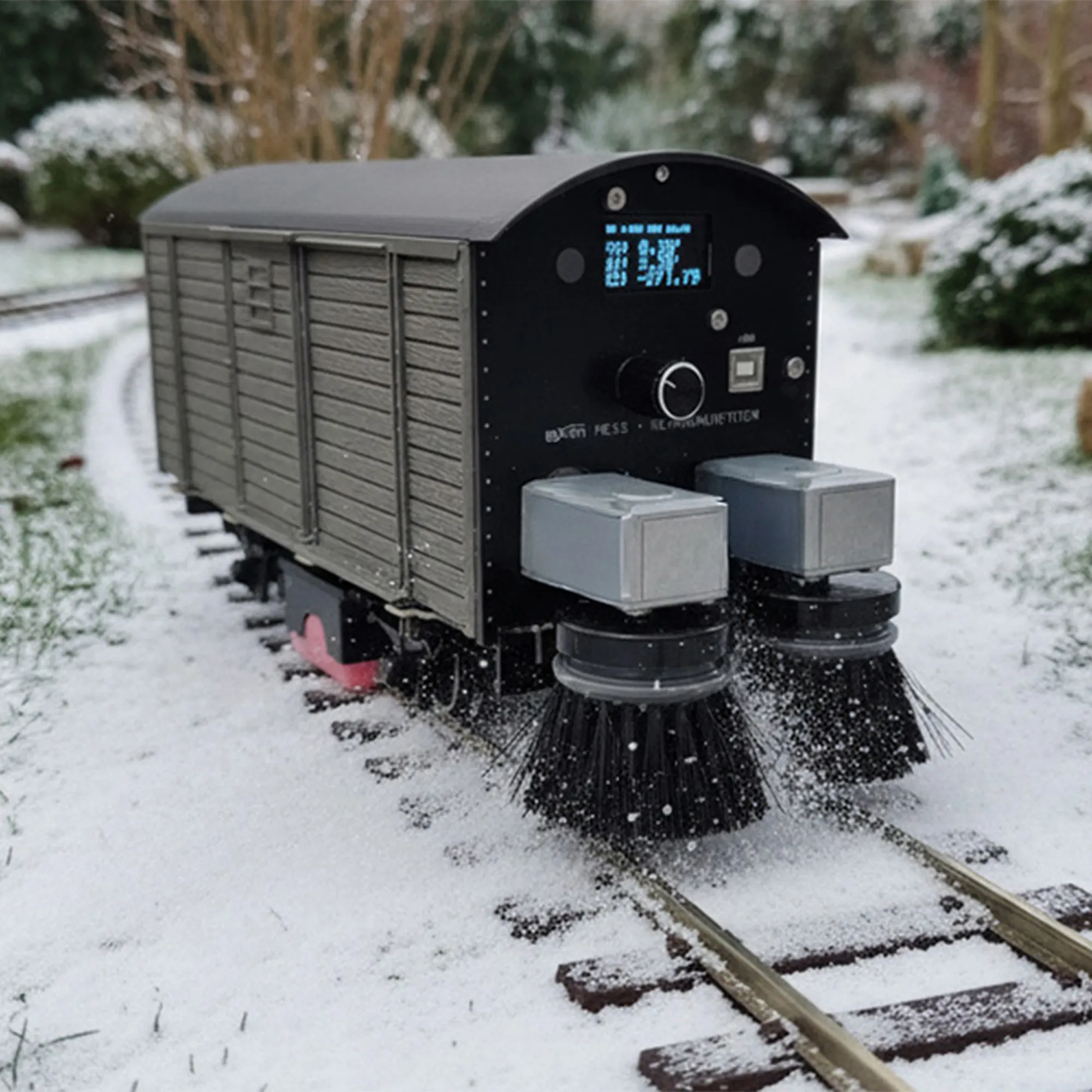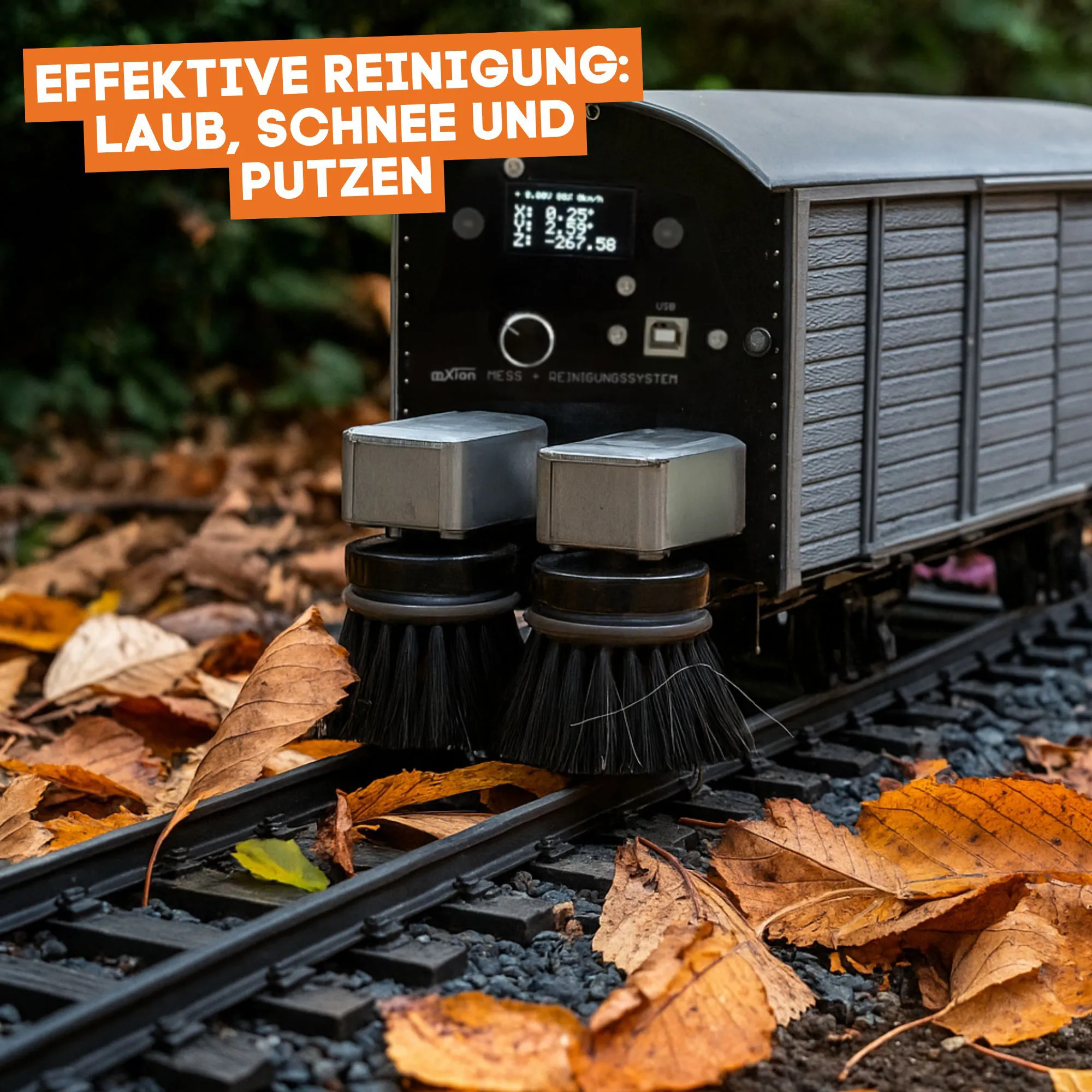 Zwei rotierende Frontbürsten räumen Laub und Schnee zuverlässig von der Strecke, während der unterseitige Schwammreiniger die Schienen sanft nachbehandelt. Das steigert dauerhaft Stromabnahme und Laufruhe und schafft eine saubere Basis für reproduzierbare, präzise Messfahrten.