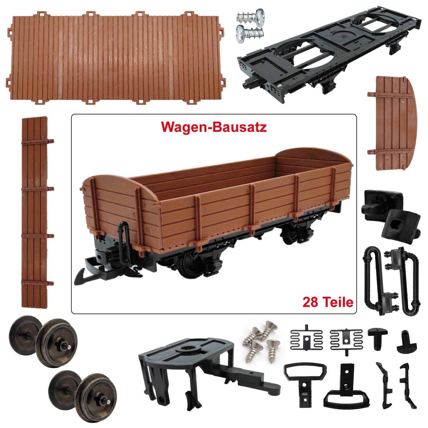 Der Niederbordwagen-Bausatz in braun setzt sich aus insgesamt 28 Einzelteilen zusammen. Dank der detaillierten Bauanleitung gestaltet sich der Zusammenbau als recht unkompliziert.