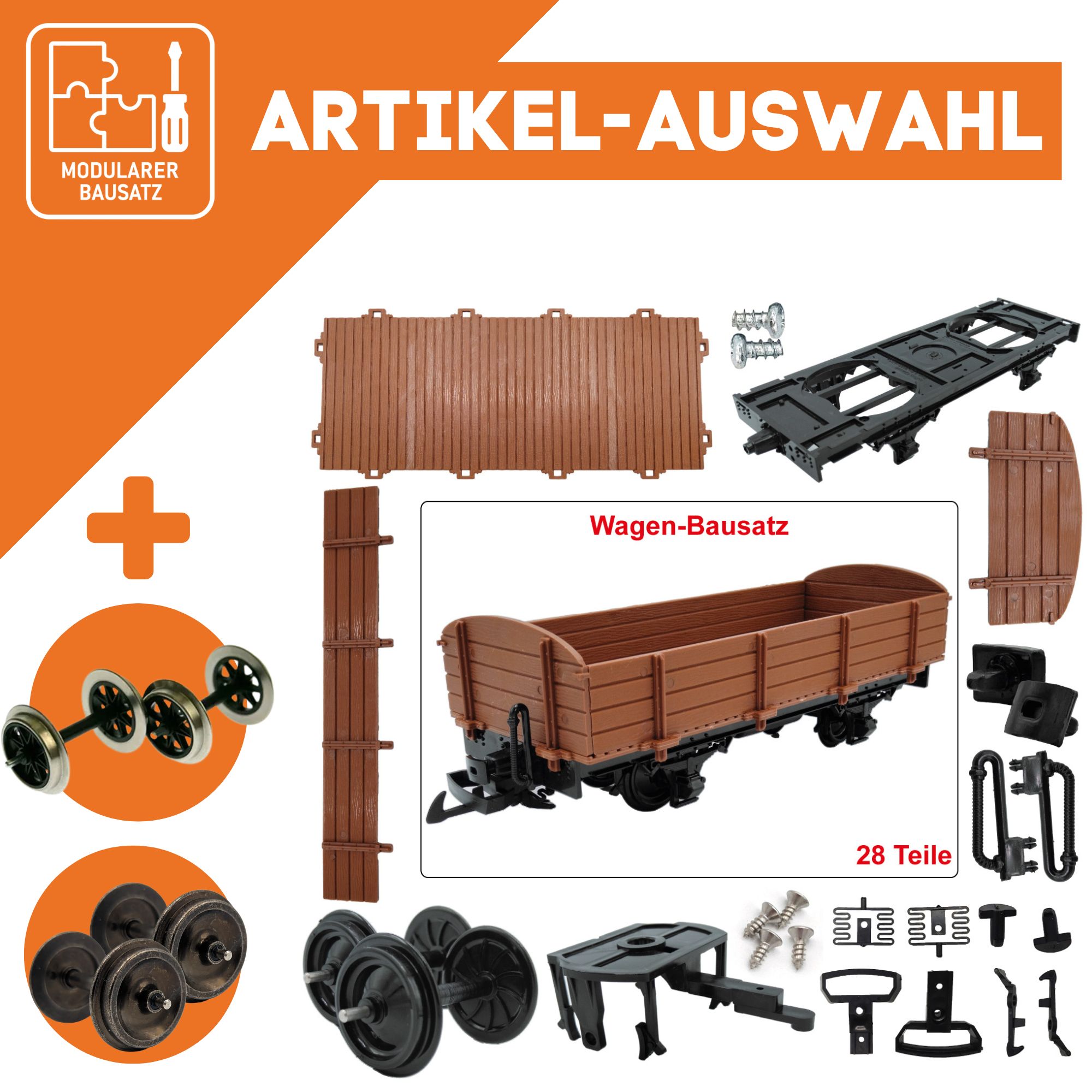 Brauner Niederbordwagen als Spur-G Bausatz mit stabilem Rahmen, modularer Ausführung und Varianten mit unterschiedlichen Radsätzen.