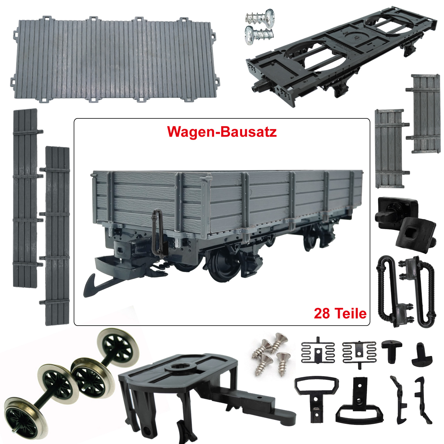 Der Niederbordwagen-Bausatz in Grau umfasst 28 Einzelteile. Die detaillierte Bauanleitung sorgt für einen unkomplizierten Zusammenbau.