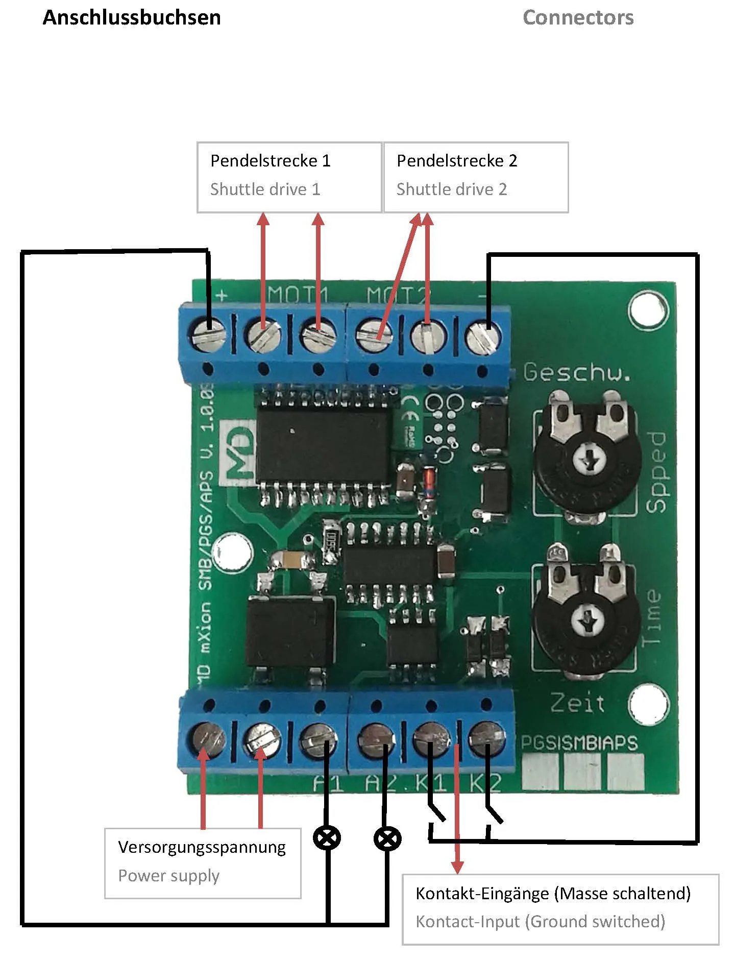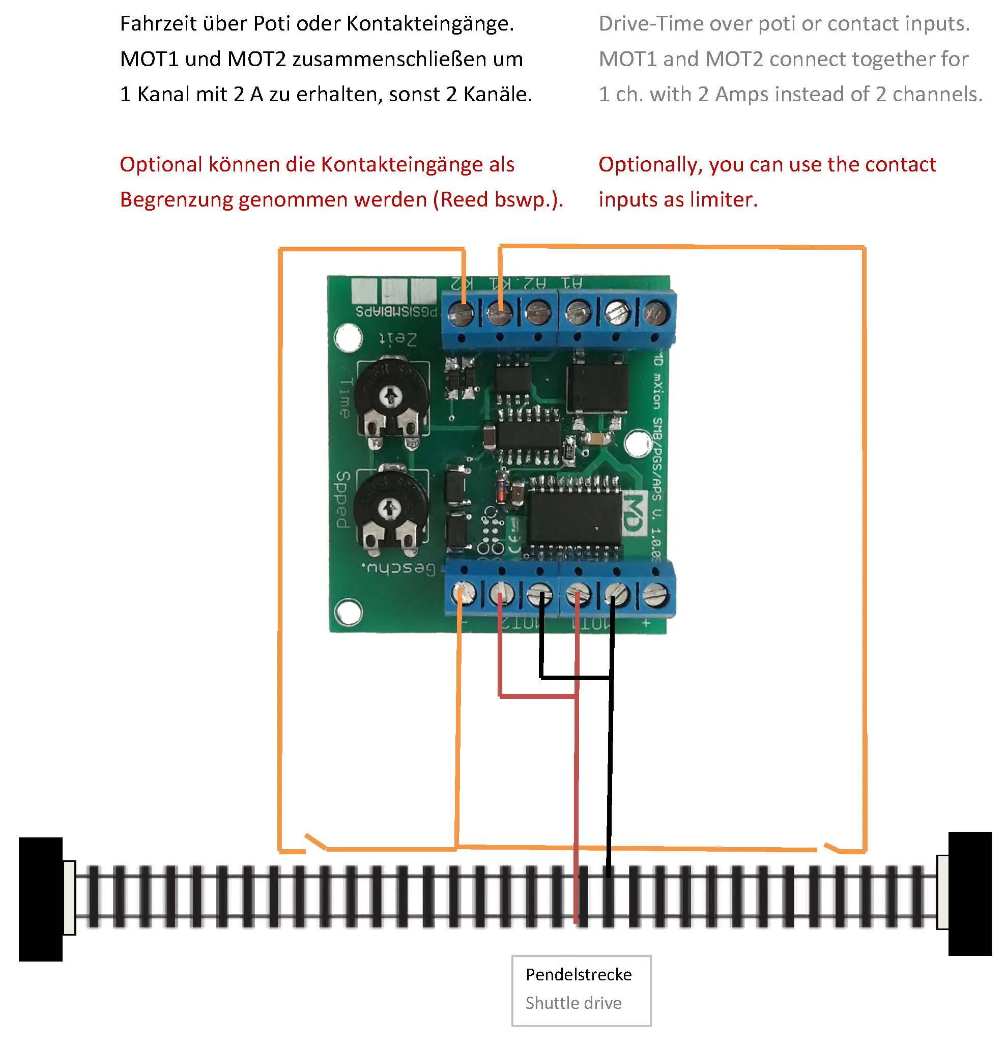 Die analoge Pendelautomatik ist ein vielseitig einsetzbares Modul. Es bildet eine Pendelzugsteuerung mit Softstart und vorbildgerechtem langsamen Abbremsen. Die Steuerung der Halte- und Fahrzeit erfolgt über integrierte Potis. Optional können auch die Kontakte K1 und K2 als Endpunktbegrenzung genutzt werden (Schalten eines Schalters, Reed oder einer Lichtschranke). Die analoge Pendelautomatik hat 2 Kanäle mit je 1 A Belastbarkeit. Die beiden Kanäle können auch vereint genutzt werden, sodass man 1 Kanal mit 2 A Belastbarkeit zur Verfügung hat.