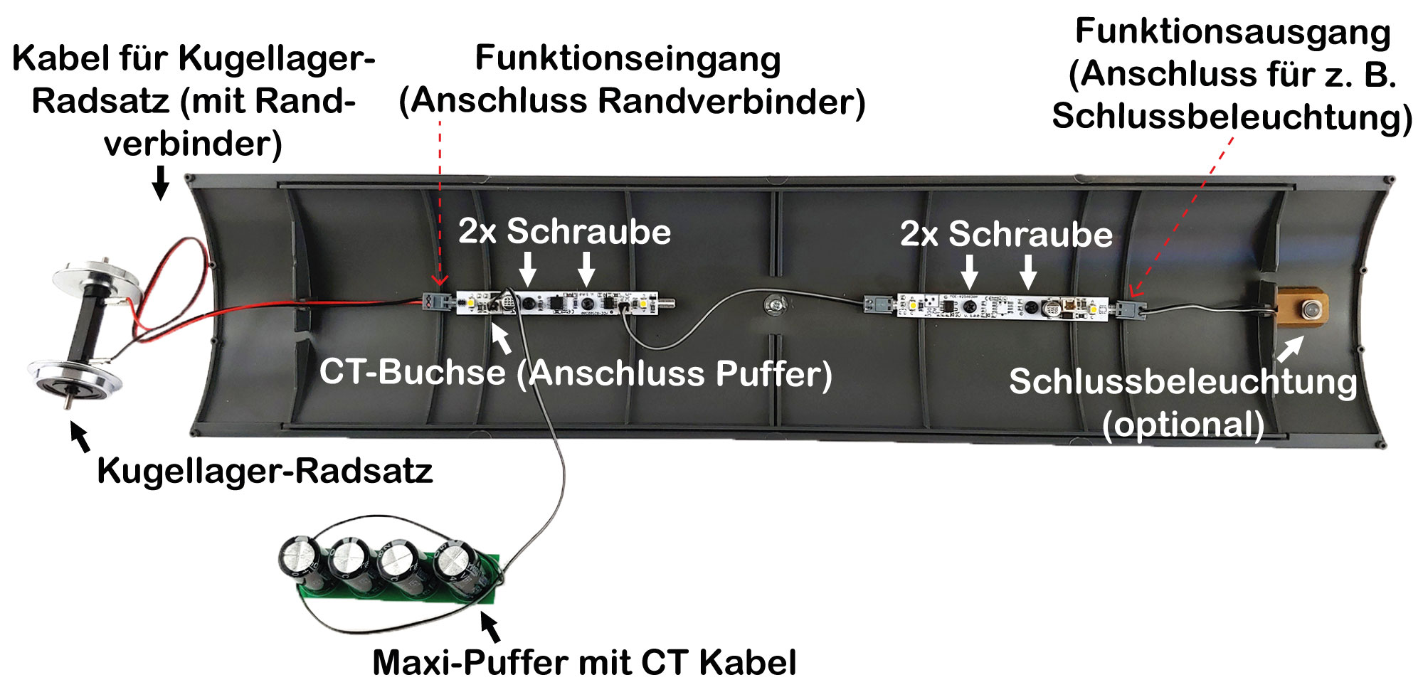 Ermöglicht den einfachen Anschluss von Wagenbeleuchtungen – ohne zusätzliche Umbauten oder komplizierte Verkabelungen auf Ihrer Modellbahnanlage. Maßlich kompatibel