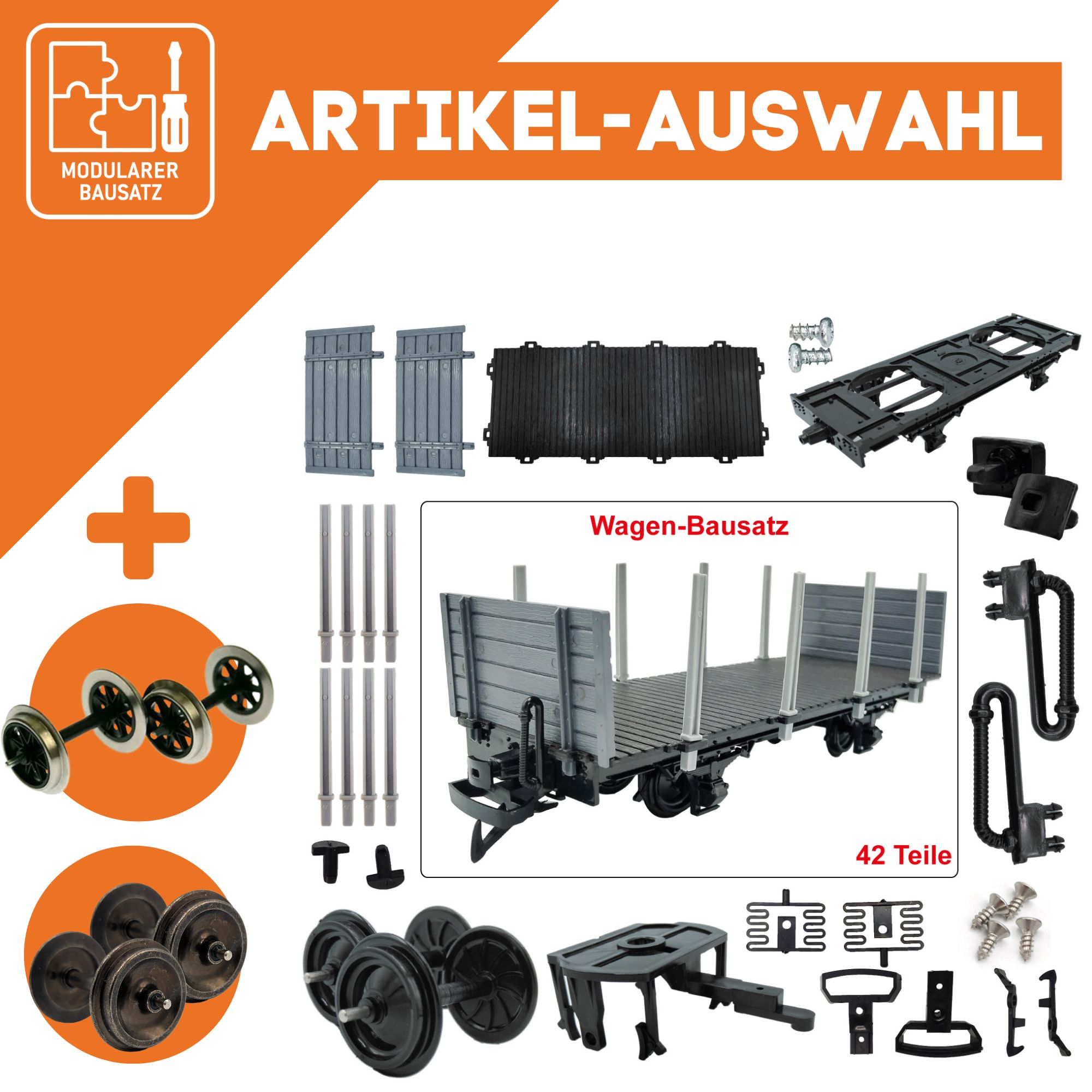 Rungenwagen mit Seitenwänden schwarz/grau als Spur-G Bausatz mit steckbaren Rungen, modularer Ausführung und Varianten mit unterschiedlichen Radsätzen.