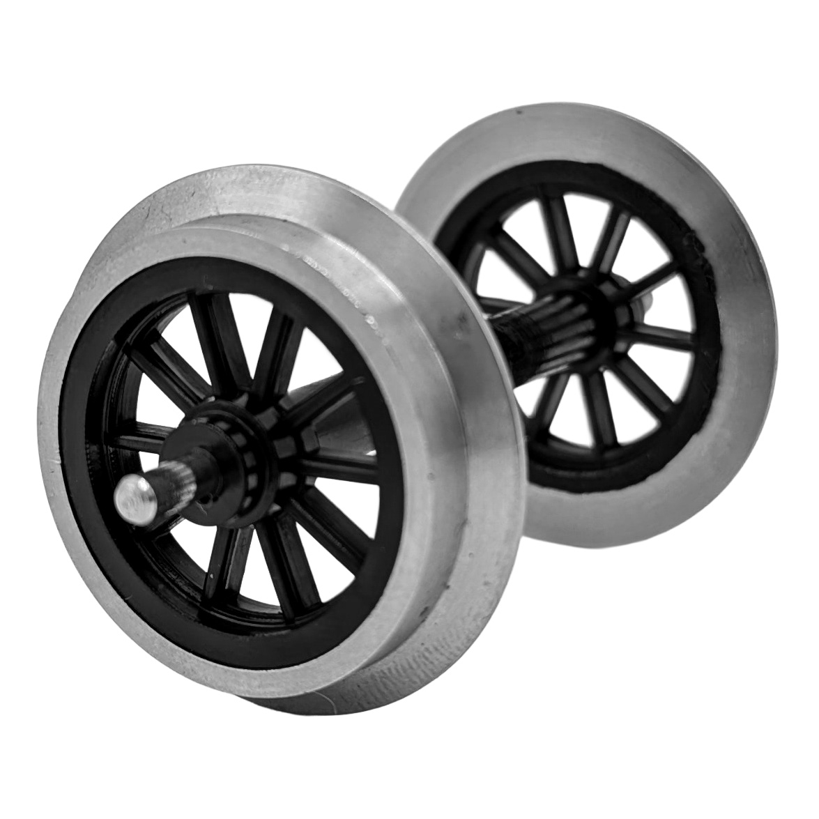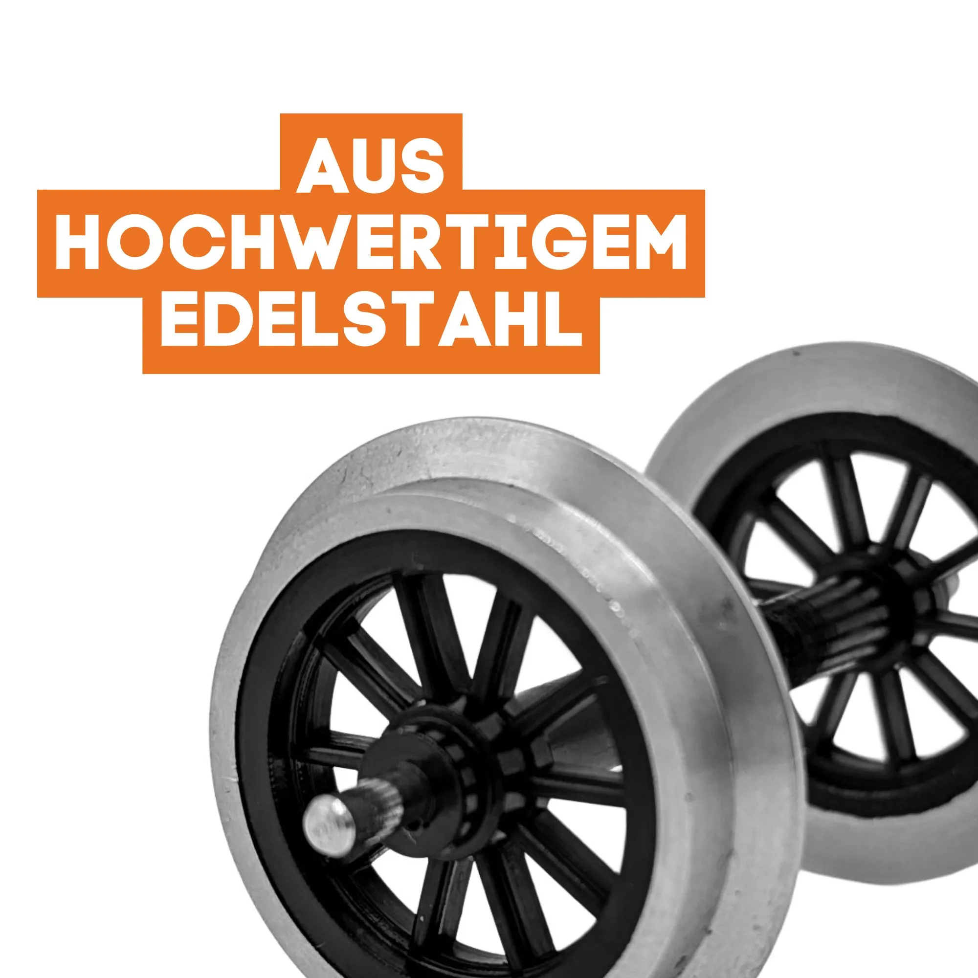 Hochwertiger Speichenradsatz mit 31 mm Edelstahl-Lauffläche und 37 mm Durchmesser für Spur G, nicht stromführend. Sorgt für Laufruhe, authentische Fahrgeräusche und dauerhaft saubere Gleise. Ideal für Wagen ohne Stromabnahme.