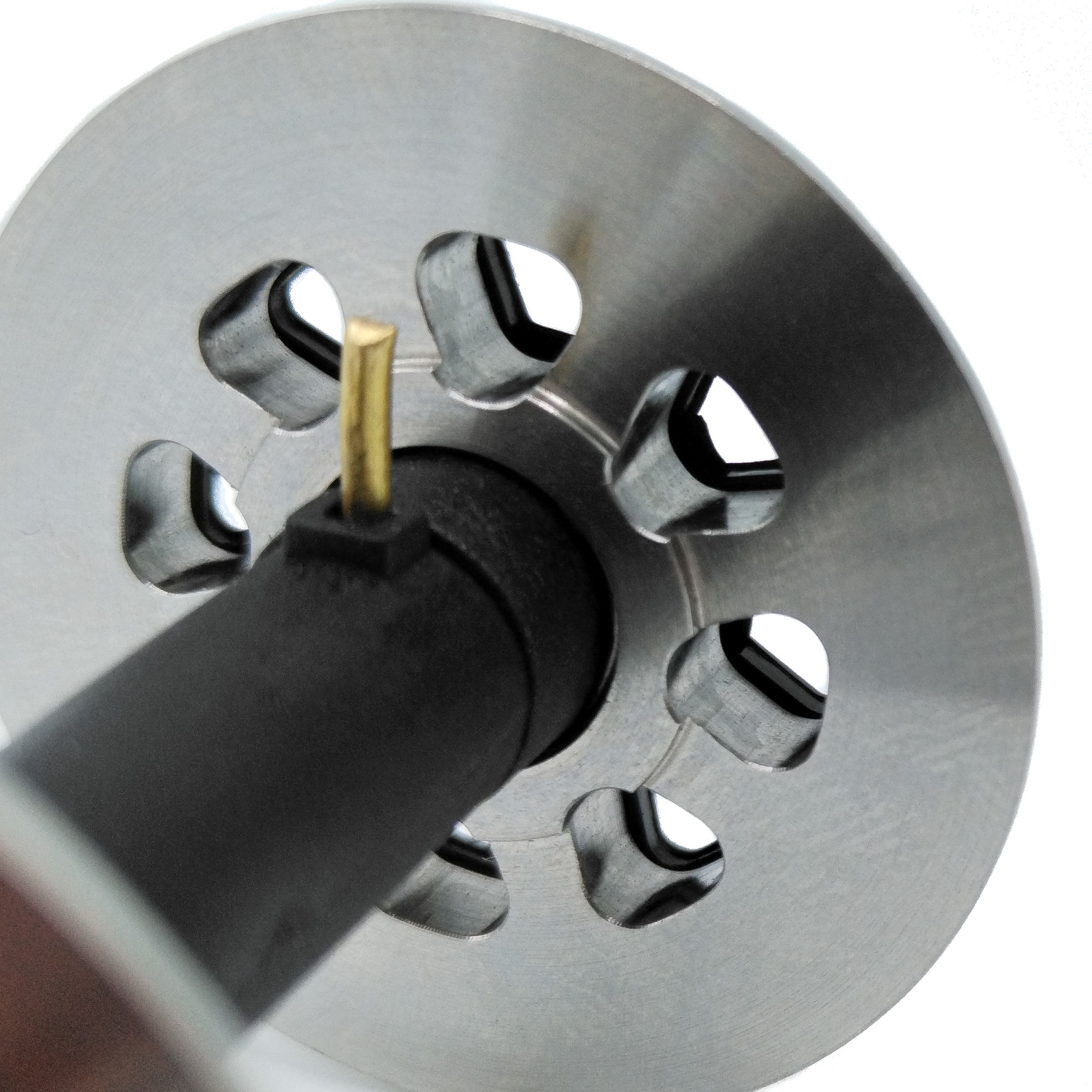 Gefräster Edelstahl sorgt für maximale Haltbarkeit, glatten Lauf und dauerhaft exakte Rundlaufeigenschaften ohne Korrosion. Integrierter Stromabnehmer