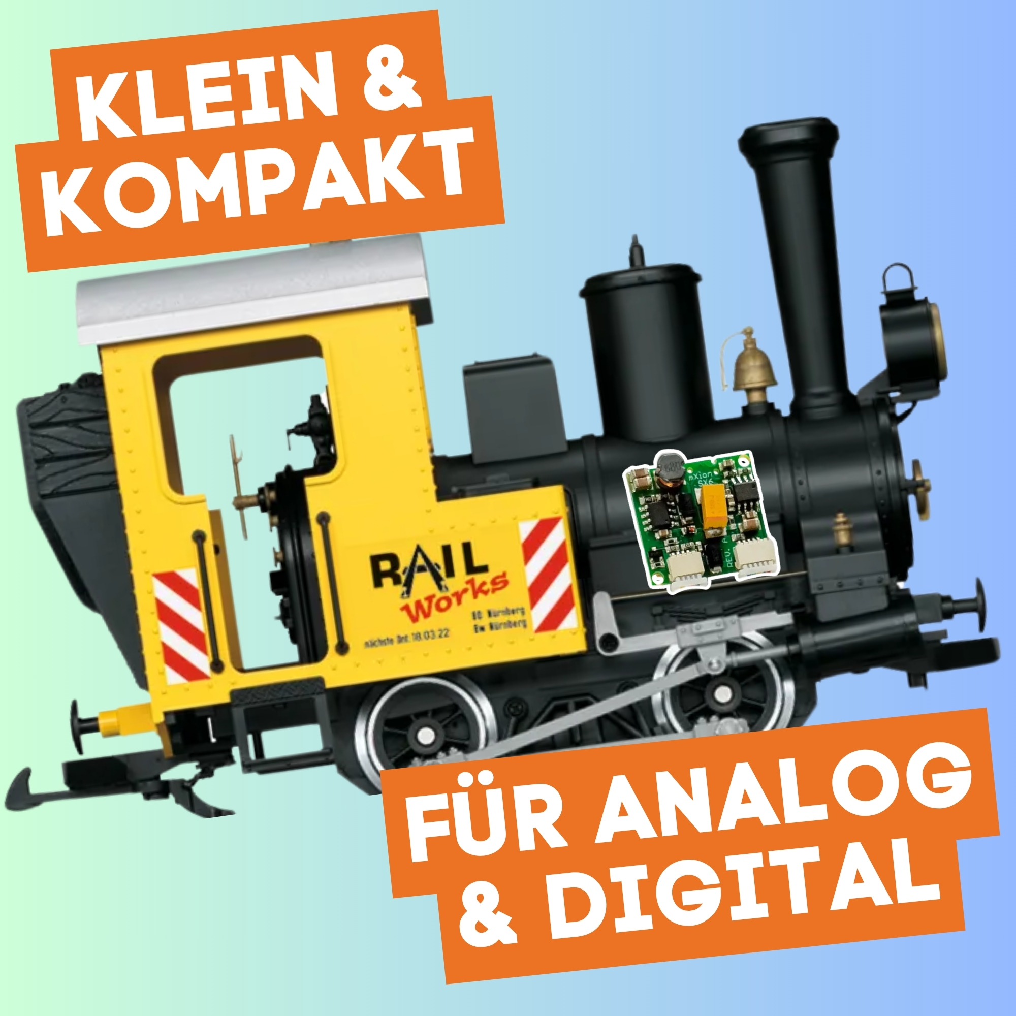 Kompakte Maße und flexibel einsetzbar Mit 27 × 18 × 15 mm passt das SX6 in enge Bereiche von Elektro-Loks. Der Einsatz ist digital mit microSUSI und analog über SUSI-Wandler möglich, sodass vom klassischen Analog-Setup bis zur späteren Umrüstung derselbe Klangbestand genutzt werden kann.