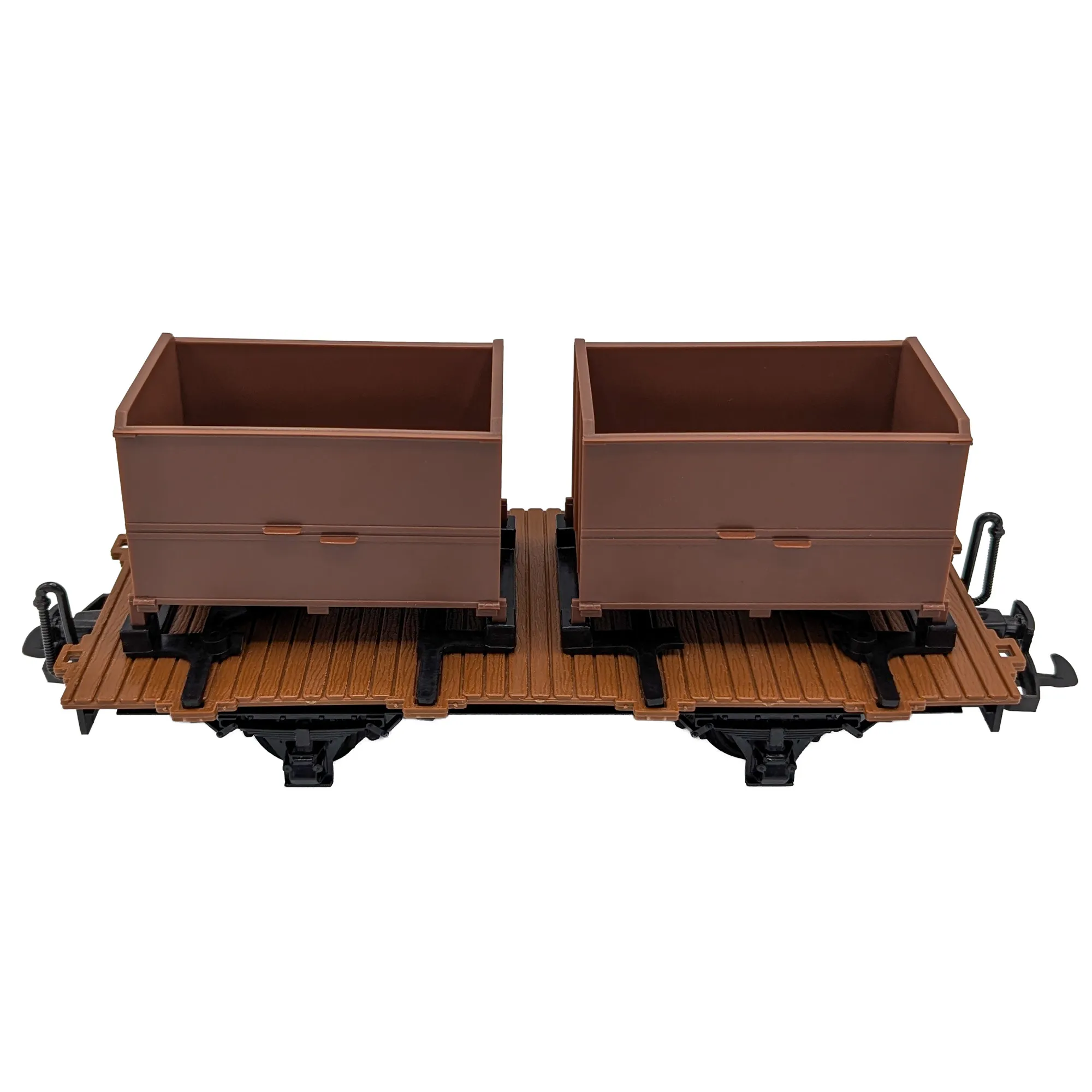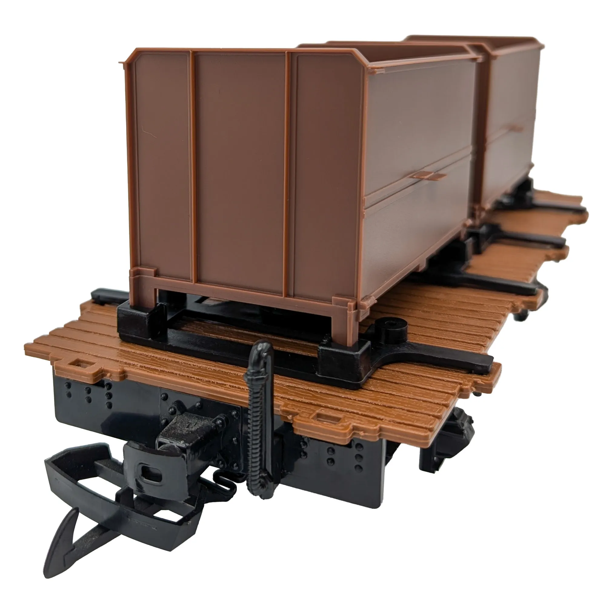 Wagenset (Bausatz) mit Holzbohlen-Plattform auf kurzem 2-Achs-Rahmen sowie zwei braunen Kastenlorenaufsätzen.
