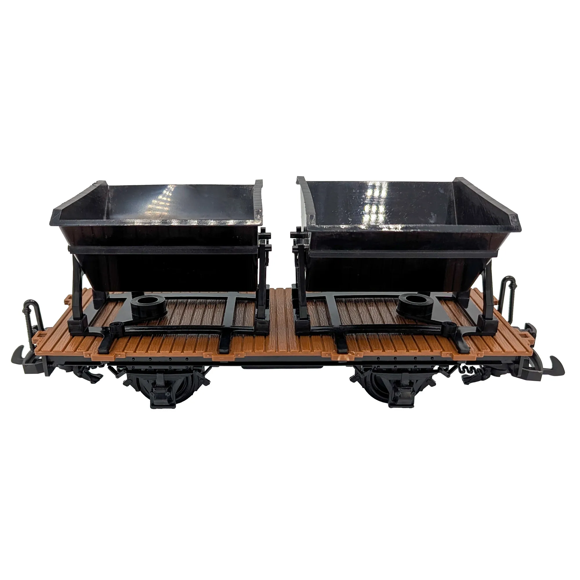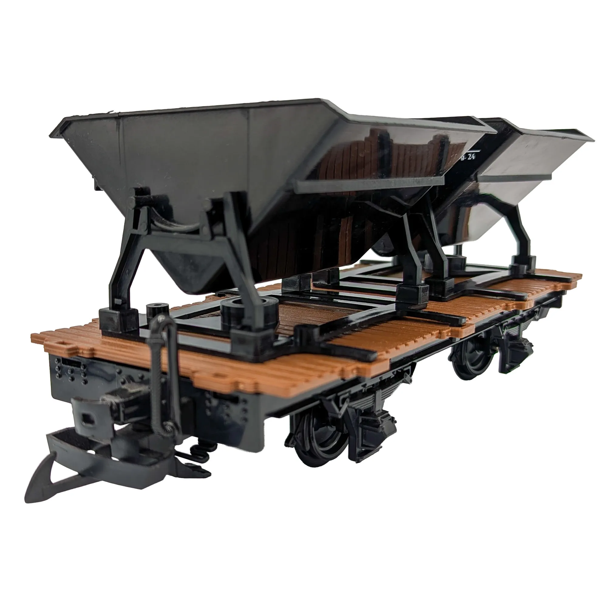 Wagenset (Bausatz) mit flacher Holzbohlen-Plattform, 2 Lorenadaptern, 4 Wannenhaltern und zwei schwarzen Kipplorenwannen. Kurzer 2-Achs-Rahmen, klebstofffreie Montage, laufruhiger Betrieb, vorbildgetreue Kippszenen.