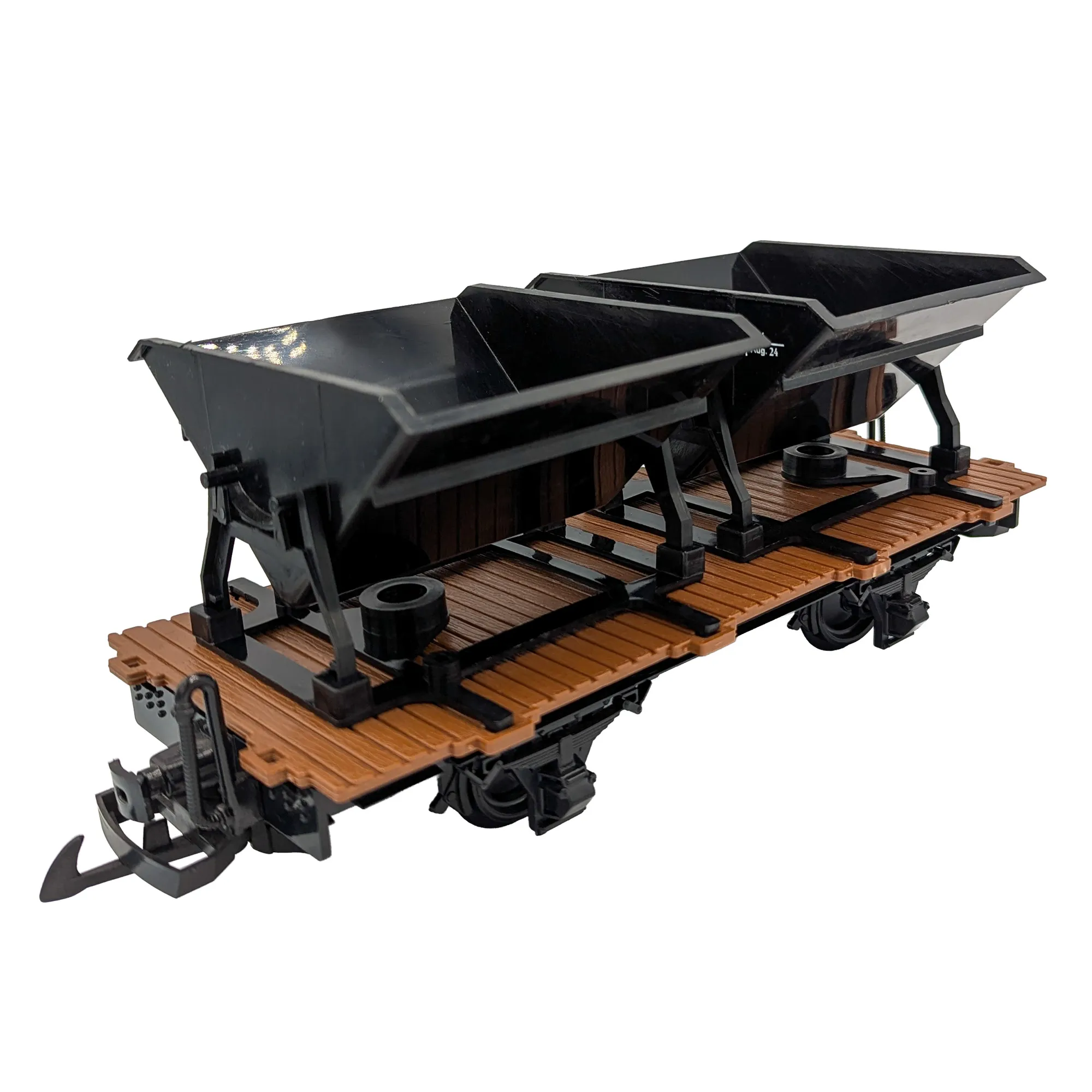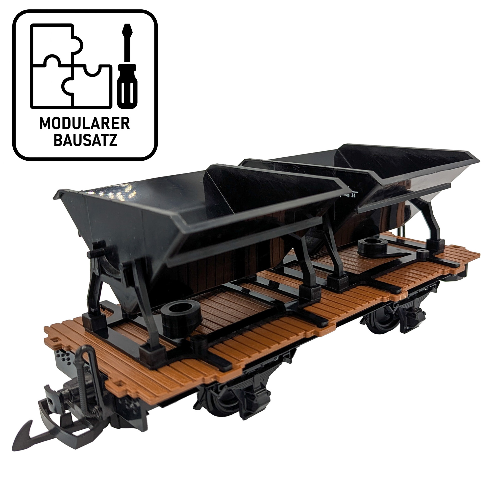 Wagenset – Basis und Montage Die Grundlage bildet ein flacher Wagenbausatz mit durchgehender Holzbohlen-Ladefläche auf kurzem, zweiachsigem Fahrrahmen; verwindungsarm konzipiert, mit niedriger Ladehöhe und klar definierten Auflagepunkten. Als Doppel-Kipplore ist das Set vollständig aufeinander abgestimmt; die Montage erfolgt über definierte Steck-/Schraubverbindungen klebstofffrei und servicefreundlich. Positionierhilfen unterstützen das exakte Ausrichten der Baugruppen, die schwarzen Wannen setzen einen sachlich-industriellen Akzent und sorgen für gute Lesbarkeit im Zugverband.