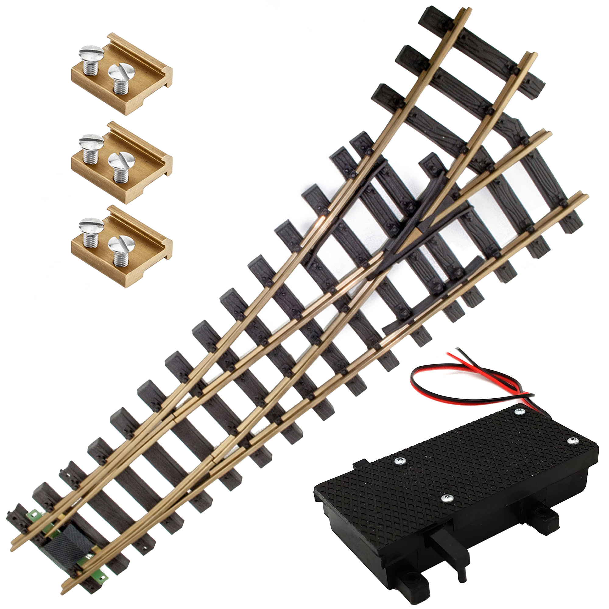 Set bestehend aus einer linken Messing-Weiche (R3 / 120 cm), drei Schraubverbindern sowie einem digitalen Weichenantrieb mit Herzstückrelais, schaltbaren Funktionsausgängen und individuell einstellbarer Stellgeschwindigkeit. Kompatibel mit allen gängigen
