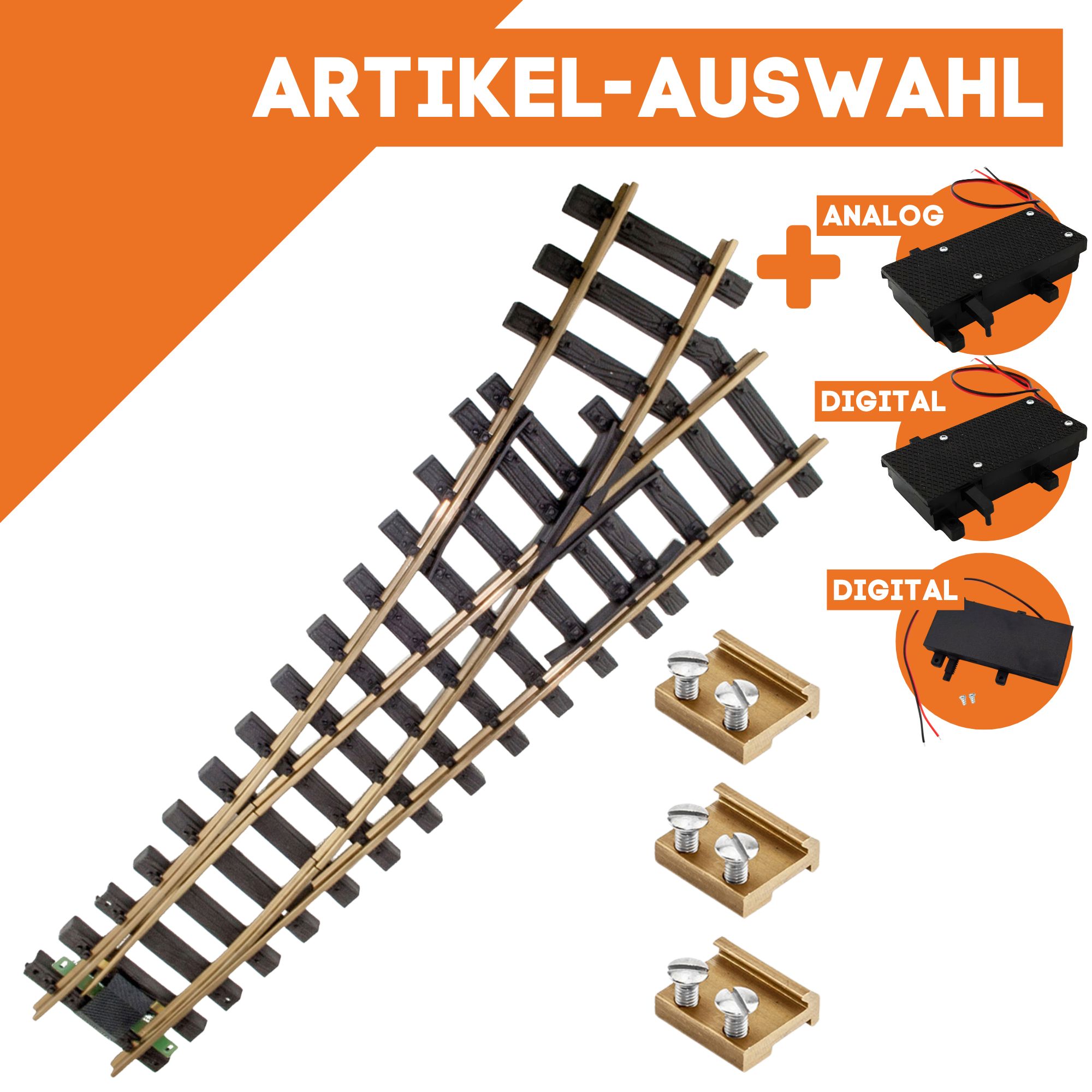 Linke Messingweiche mit Verbindern für stabile Stromführung, ruhige Übergänge und langlebigen Betrieb auf Innen- und Außenanlagen.