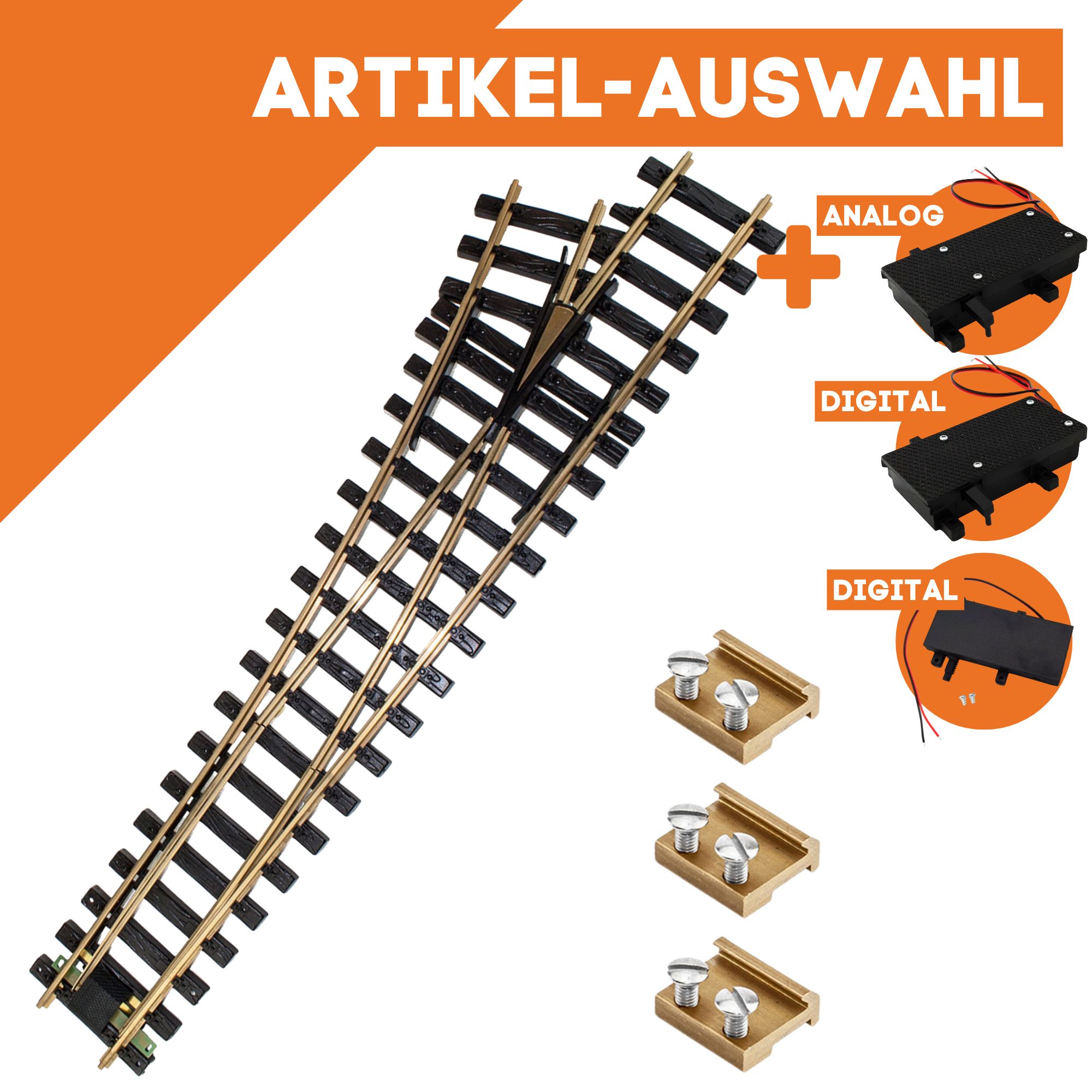 Links abzweigende Messingweiche im Radius R5 für langfristig zuverlässigen Betrieb auf Innen- und Außenanlagen. Messingprofile sichern stabile Stromübertragung, präzise Zungenauflagen und definierte Übergänge fördern leises, ruckarmes Rollen. Die beiliegenden Verbinder erzeugen mechanisch feste, elektrisch leitfähige Stoßstellen und halten den Fahrstrom über die Übergänge konstant. Einheitliche Maße erleichtern Austausch, Erweiterung und planbare Wartung, sodass Züge auch bei Schleichfahrt sicher durch den Abzweig laufen.