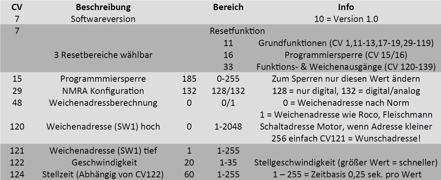 Der integrierte Decoder unterstützt bitweise Programmierung, POM (Hauptgleisprogrammierung), CV-Verwaltung sowie eine Programmsperre über CV 15/16. Stellzeit (CV 124) und Geschwindigkeit (CV 122) sind präzise einstellbar.