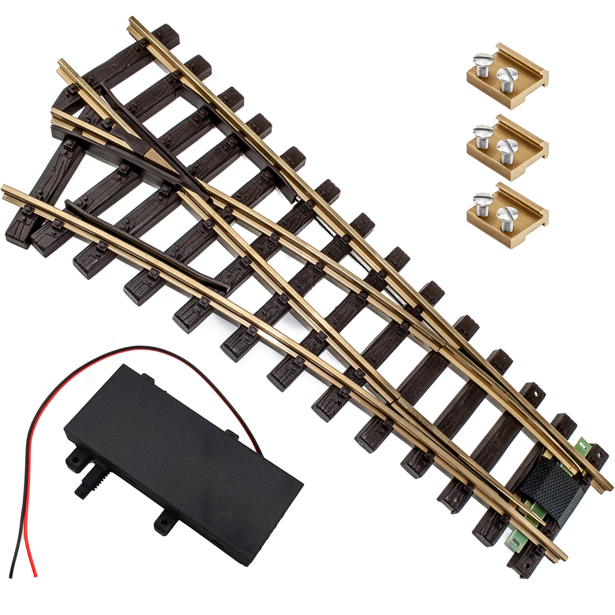 Set bestehend aus einer linken Weiche (R 90 cm) aus Messing, drei Schraubverbindern sowie einem digitalen TL-Weichenantrieb mit präzisem Metallgetriebe und vollständig geschlossenem Schutzgehäuse gegen Feuchtigkeit. Passend für alle gängigen Spur-G-Gleiss