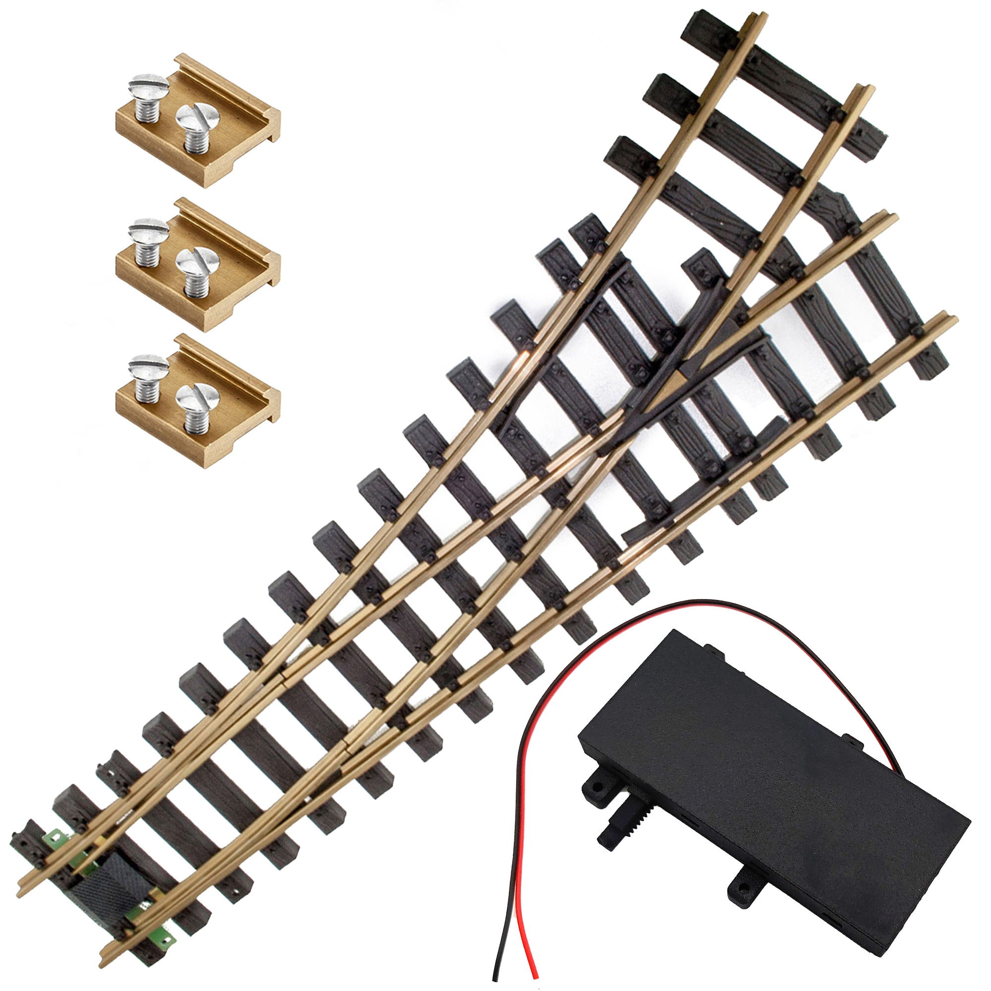Set bestehend aus einer linken Messing-Weiche (R3 / 120 cm), drei Schraubverbindern sowie einem digitalen TL-Weichenantrieb mit wettergeschütztem Gehäuse, exakter Stellmechanik und programmierbarer Steuerung per CV. Geeignet für alle gängigen Spur-G-Gleis