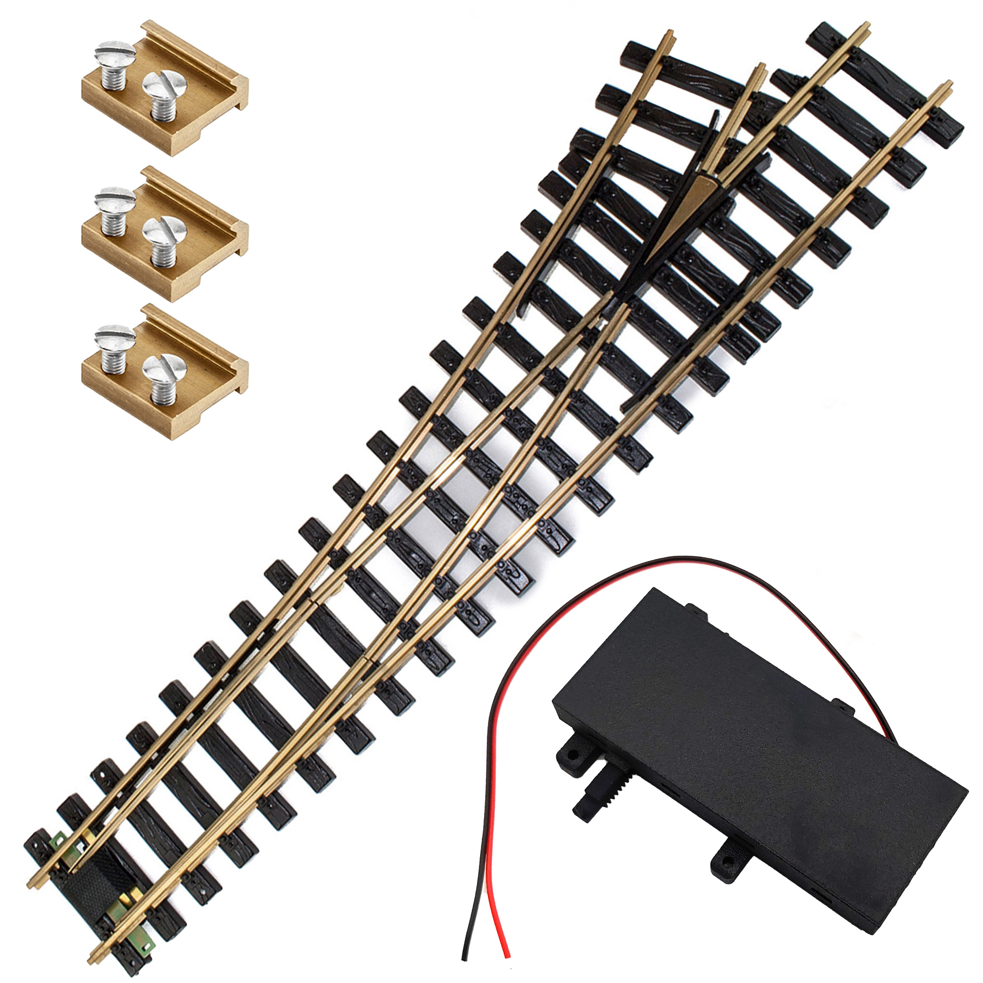 Set mit linker R5-Messing-Weiche (210 cm) inklusive 3 Schraubverbindern sowie digitalem TL-Weichenantrieb ML-Train 84020002 mit robustem Gehäuse, langsamer Stelllogik und CV-Steuerung.