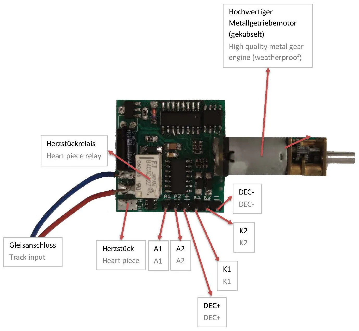 Funktionsbeschreibung Der DWA ist ein motorisch gesteuerter Antrieb für Weichen und Signale mit zwei schaltbaren Funktionskanälen, z. B. zur Ansteuerung von Laternen oder Signalen. Die Herzstückpolarisation erfolgt direkt über das integrierte Relais im Gerät. Bei Kurzschluss genügt das Tauschen der Einspeisepole. Die Endabschaltung arbeitet automatisch; die Aufschneidfunktion ist per CV steuerbar. Für LGB-Entkuppler: Mit CV 49 Bit 0/1 wird das Symbol „E“ synchron zur Weichenlage geschaltet und zeigt so den Entkupplungszustand an. Die Einschaltlage (SW1) legt eine feste Startstellung fest – etwa Weiche = gerade, Signal = grün. Auch invertierbar.