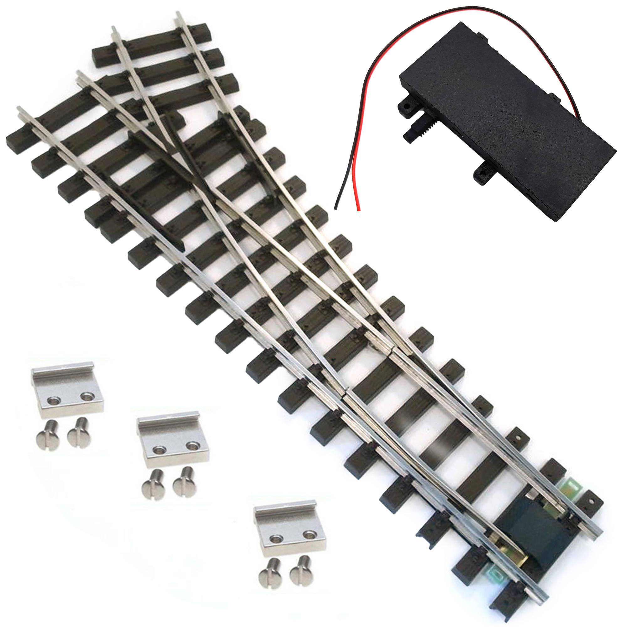 Set mit vernickelter Rechtsweiche (R 120 cm) inklusive drei Schraubschienenverbindern sowie digitalem TL-Weichenantrieb mit geschlossenem, wettergeschütztem Gehäuse, kraftvollem Metallgetriebemotor und individuell einstellbarer Stellgeschwindigkeit.