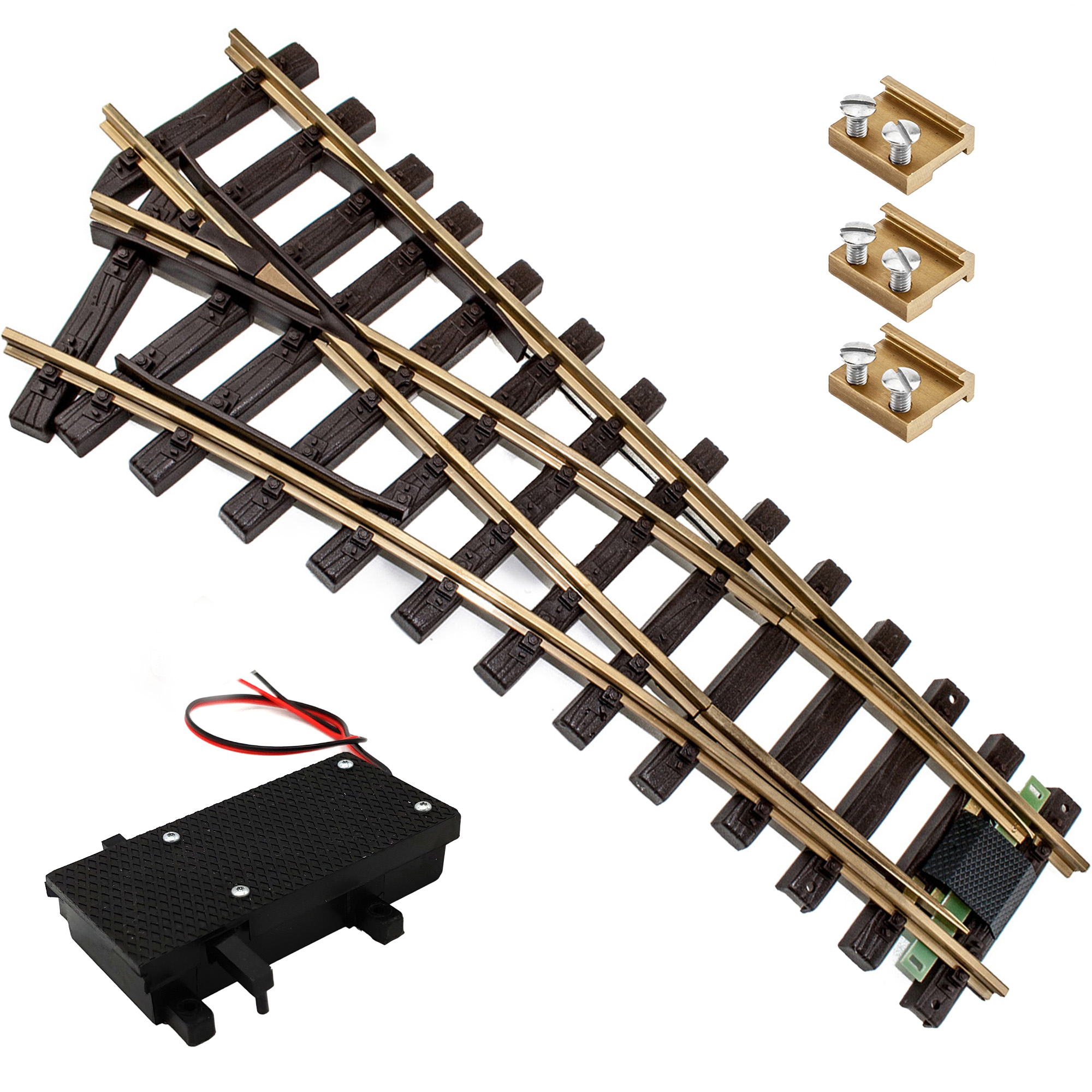 Set bestehend aus einer linken Weiche mit 90 cm Radius aus Messing, drei passenden Schraubverbindern sowie einem analogen Antrieb für den Weichenbetrieb. Passend zu allen gängigen Gleissystemen der Spur G.