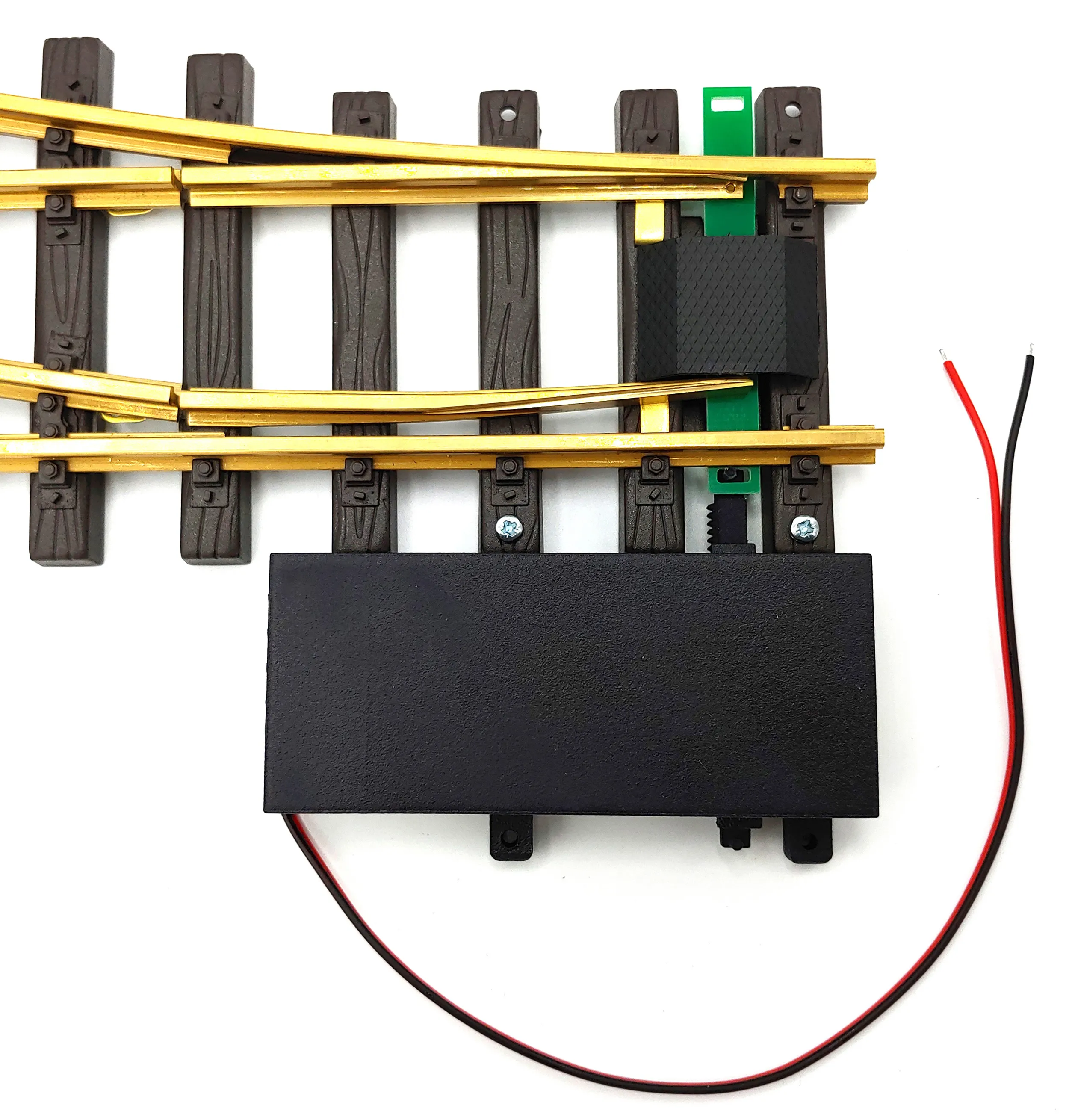 Der analoge Weichenantrieb wird seitlich an der Weiche montiert. Das Train-Line45-Gehäuse ist auf die Bohrbilder gängiger Spur-G Weichen abgestimmt. Die Befestigung erfolgt mit den beiliegenden Schrauben, sodass die Montage zügig und sicher durchgeführt werden kann.